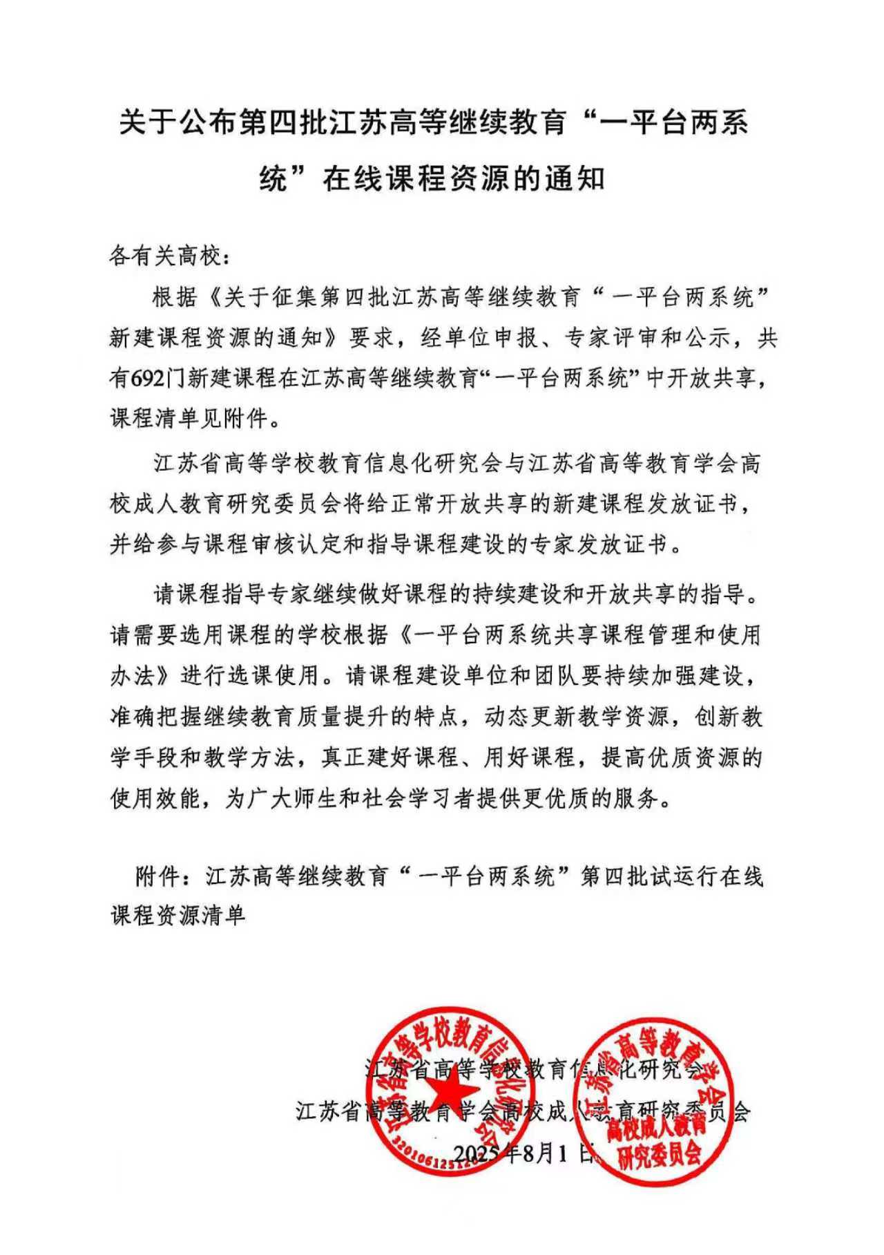 作为江苏省落实《教育部关于推进新时代普通高等学校学历继续教育改革的实施意见》(教职成〔2022〕2号)的核心载体,“一平台两系统建设工程”通过构建“省级统筹、院校联动、动态更新”的课程资源体系,着力破解传统继续教育中存在的教学方式单一、资源更新滞后等难题。自2023年工程启动以来,我校继续教育学院系统推进课程重构与数字化转型,在各二级学院及相关课程团队的大力支持下建立“课程负责人+教学团队+技术支持”的协同建设机制,现已累计82门课程入选继续教育优质在线课程资源。