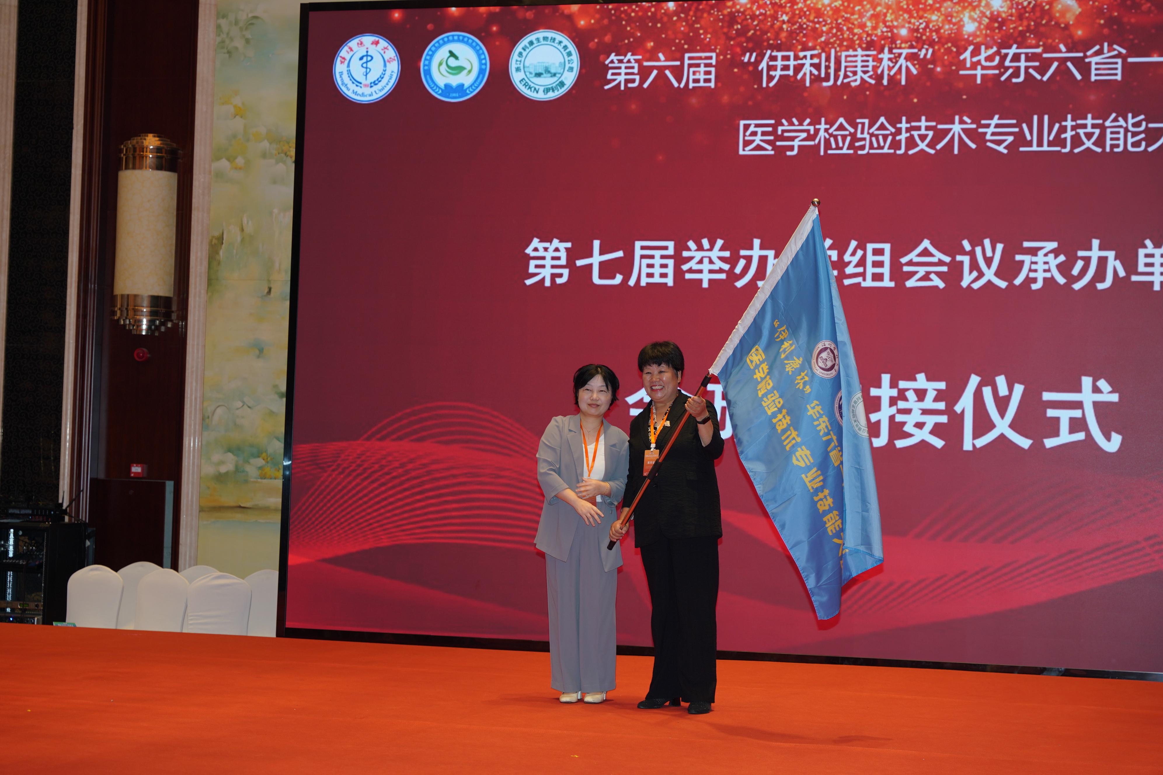 闭幕式上,医学技术学院副院长李洪春受邀参加会旗交接仪式。当象征赛事传承的会旗交至其手中,大会正式宣布2026年第七届赛事由我校承办。这不仅是对本次参赛成果的肯定,更是对我校专业建设与办学能力的认可。未来,我校将以此为契机,精心筹备赛事,加强与华东地区高校合作,为推动医学检验技术专业教育发展贡献力量。