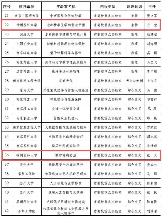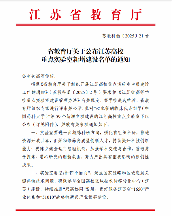 近日,江苏省教育厅正式印发《省教育厅关于公布江苏高校重点实验室新增建设名单的通知》(苏教科函〔2025〕21 号)。我校申报的“老年精准医学和衰老干预”“数智慢病防治”两大实验室成功入选省高校重点实验室新增建设名单,标志着学校在老年健康保障、慢性病精准防治领域的科研平台建设与科技创新能力迈上新台阶。