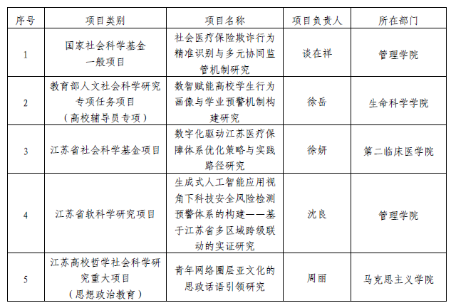 2025年度国家社会科学基金项目、教育部人文社会科学研究一般项目等高级别项目评审结果已陆续公示。我校喜获国家社会科学基金年度项目1项、教育部人文社会科学研究专项任务项目1项、江苏省社会科学基金项目1项、江苏省软科学研究项目1项、江苏高校哲学社会科学研究重大项目1项,实现了年度国家、省部级项目立项全覆盖。