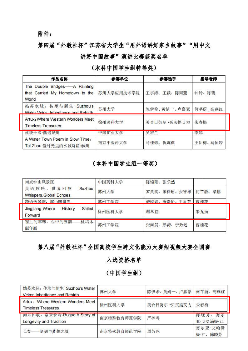 近日,第四届“外教社杯”江苏省大学生“用外语讲好家乡故事”演讲比赛在盐城落下帷幕。我校参赛选手凭借出色的语言表达能力、深入的文化理解与独特的叙事视角,斩获特等奖、一等奖各1项,其中特等奖选手获得第八届“外教社杯”全国高校学生跨文化能力大赛短视频大赛全国赛的入选资格。