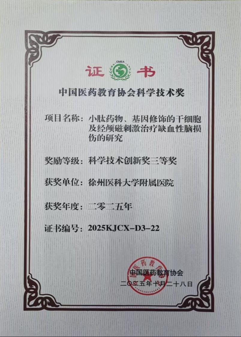 10月31日到11月2日,中国医药教育协会第三届科学技术发展大会在北京召开。来自全国各地的专家学者齐聚一堂,共同探讨医药科技的前沿趋势与未来发展方向。本次大会特别颁发了“中国医药教育协会科学技术奖”。我院急救与救援医学团队燕宪亮、胡书群、许铁等9位老师的成果《小肽药物、基因修饰的干细胞及经颅磁刺激治疗缺血性脑损伤的研究》荣获中国医药教育协会科学技术创新奖三等奖。
