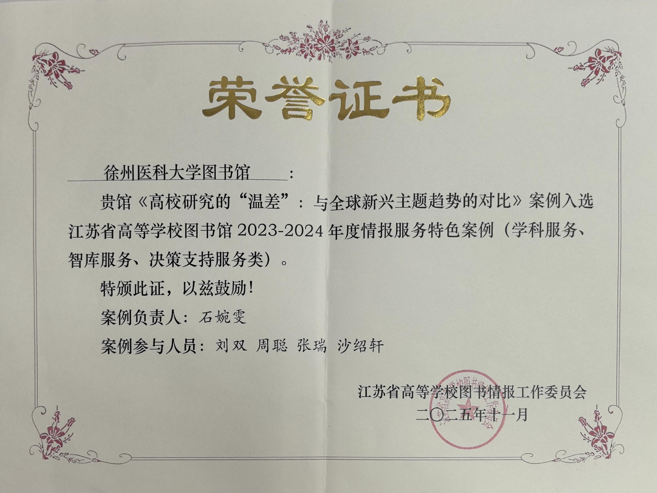 11月13日-15日,在江苏省高校图书情报工作委员会情报咨询专业委员会主办的以“AI赋能拓场景 情报服务开新局”为主题的2025年学术年会上,我校图书馆组织申报的《高校研究的“温差”:与全球新兴主题趋势的对比》案例,入选江苏省高等学校图书馆2023-2024年度情报服务特色案例(学科服务、智库服务、决策支持服务类)。