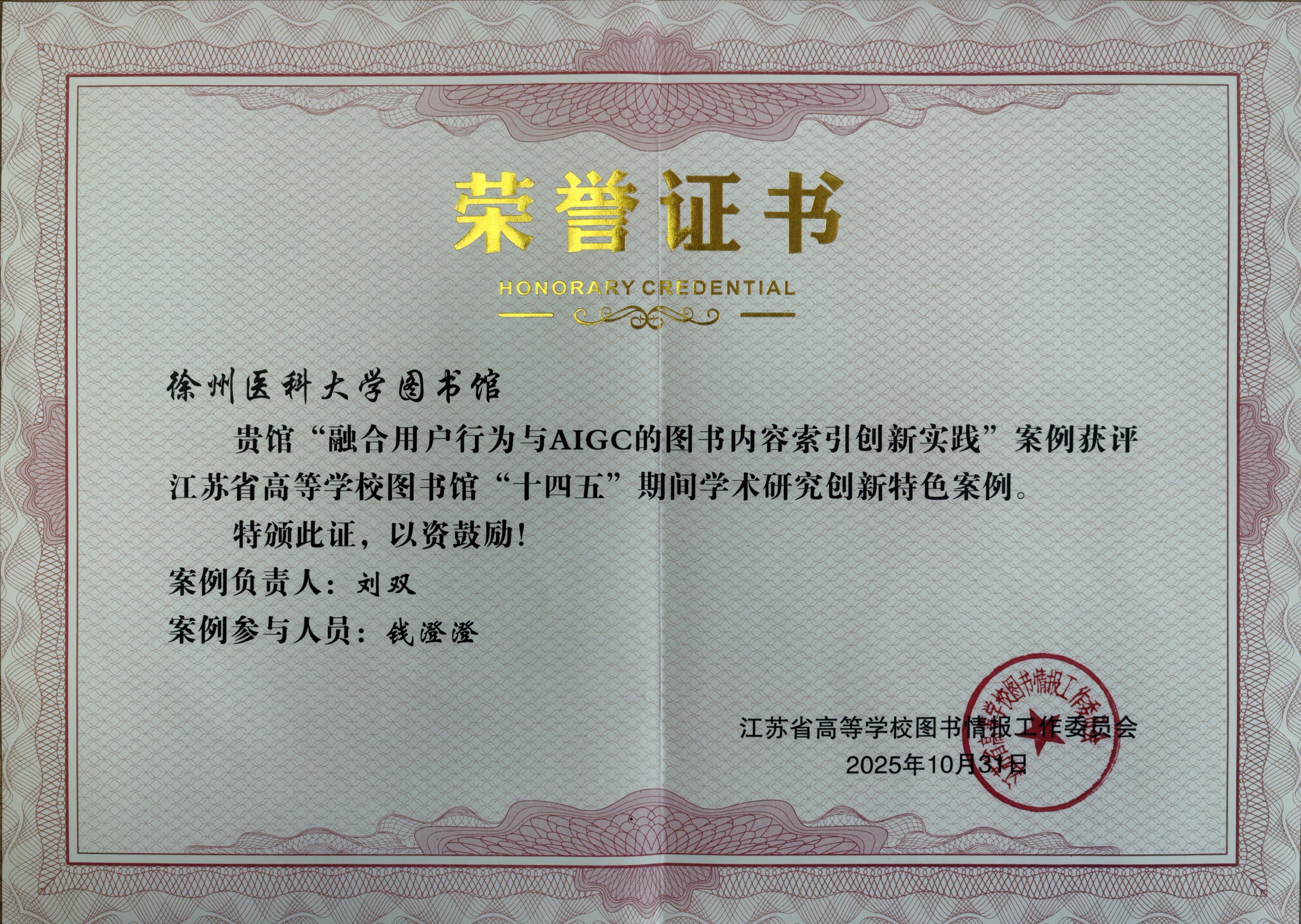 11月23日—25日,江苏省高校图书情报工作委员会学术研究与继续教育专业委员会主办了以“AI赋能 学术创新”为主题的2025年学术年会,我校图书馆组织申报的《融合用户行为与AIGC的图书内容索引创新实践》案例,入选江苏省高等学校图书馆“十四五”期间学术研究创新特色案例。