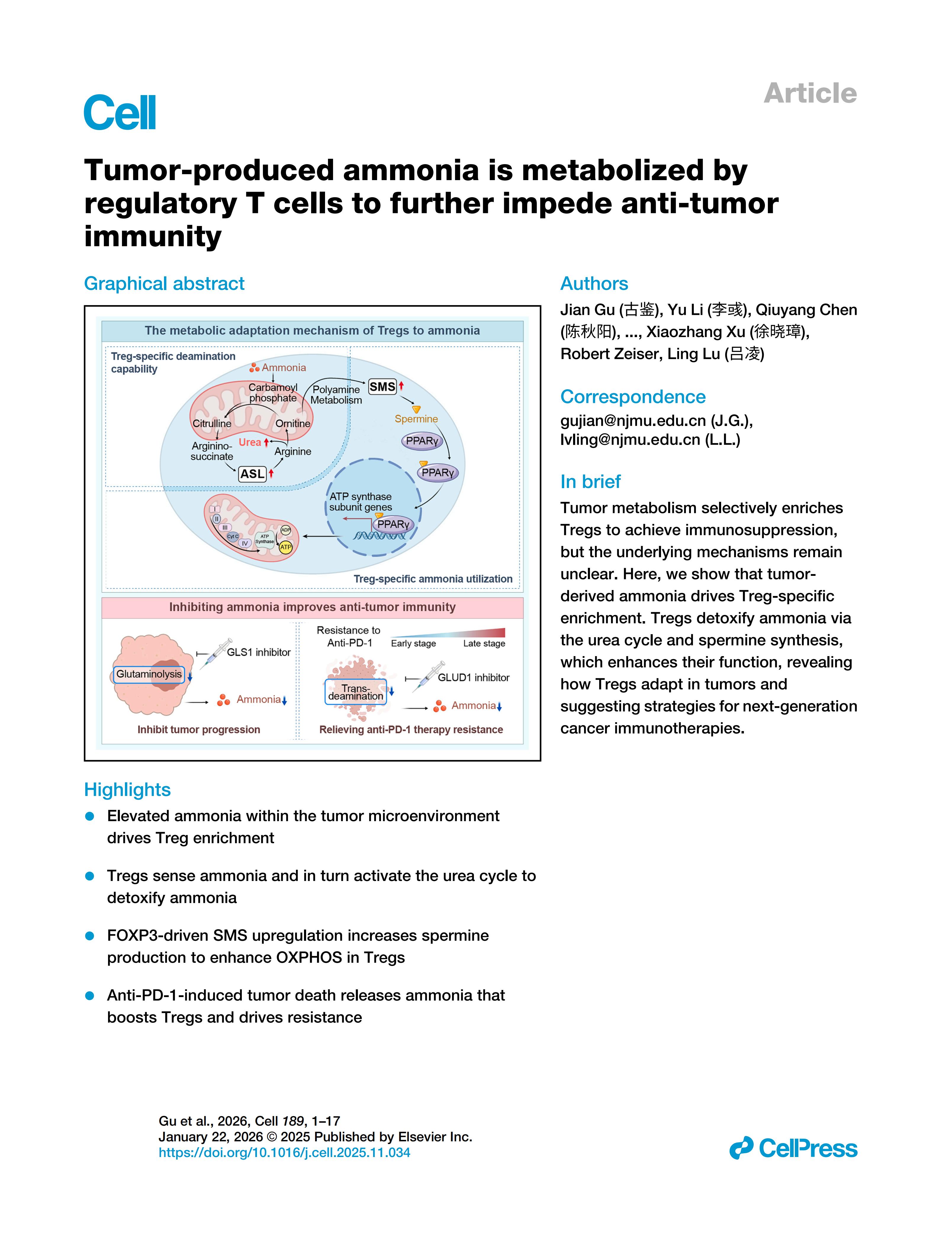 12月24日,徐州医科大学吕凌教授团队联合南京医科大学第一附属医院在国际顶级期刊《Cell》正式发表《Tumor-produced ammonia is metabolized by regulatory T cells to further impede anti-tumor immunity》研究论文。该研究表明,肿瘤产生的氨会被调节性 T 细胞(Treg 细胞 )代谢,增强 Treg 细胞,从而进一步阻碍抗肿瘤免疫反应。该研究提示了将氨生成作为靶点能够抑制 Treg 细胞,从而为抗肿瘤免疫治疗提供了一种潜在新策略。这是徐州医科大学、徐州医科大学附属医院首次以第一完成单位在国际三大顶级学术杂志发表重大研究成果,实现了高水平论文重大突破。