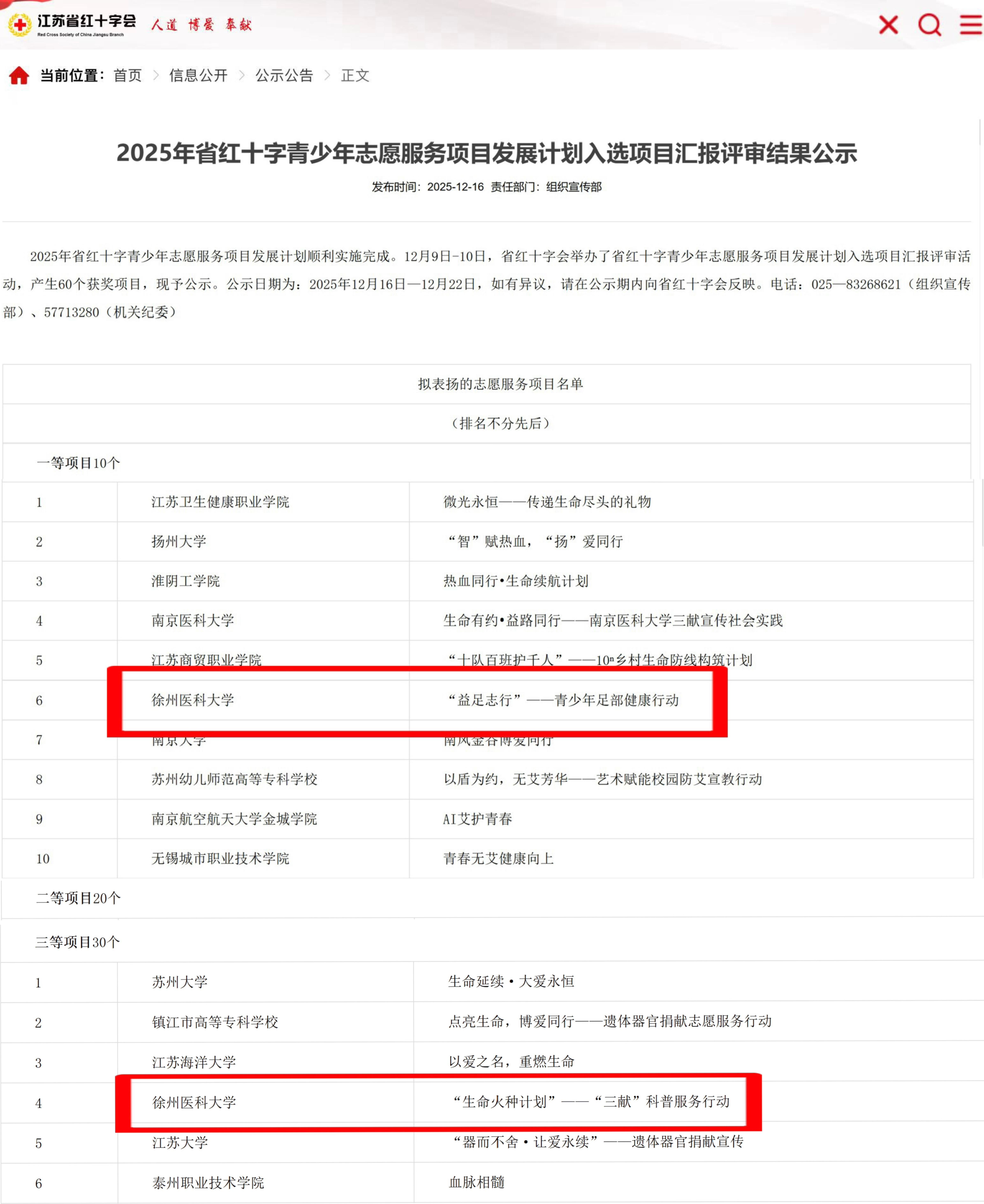 在江苏省红十字会组织下,2025年省红十字青少年志愿服务项目发展计划顺利实施完成,全省本专科院校共有80个项目入选,产生60个获奖项目,其中一等奖10项、二等奖20项、三等奖30项。经过激烈角逐,我校《“益足志行”——青少年足部健康行动》项目获评一等奖,《“生命火种计划”——“三献”科普服务行动》项目获评三等奖。