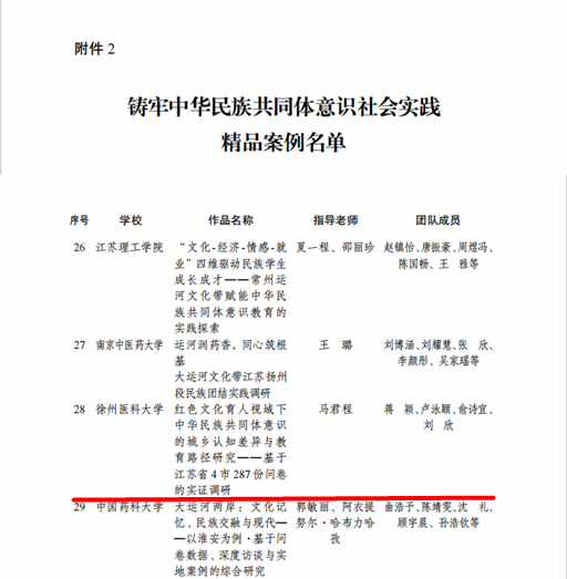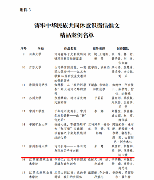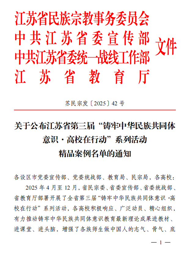 近日,江苏省民族宗教事务委员会、中共江苏省委宣传部、中共江苏省委统一战线工作部、江苏省教育厅联合印发《关于公布江苏省第三届“铸牢中华民族共同体意识・高校在行动”系列活动精品案例名单的通知》,我校2项成果脱颖而出,分别入选社会实践精品案例和微信推文精品案例。