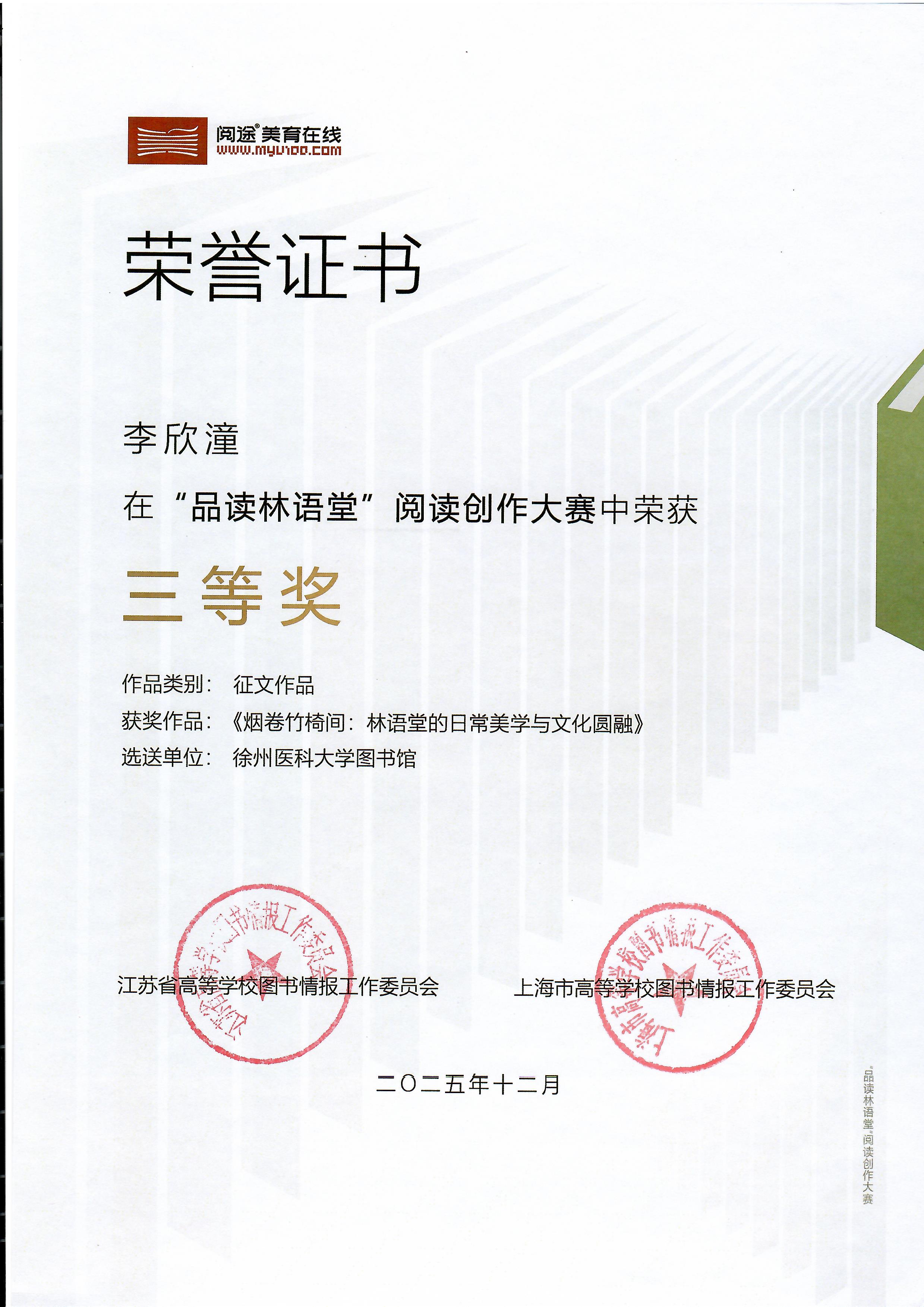 林语堂先生作为中国现代著名作家、学者和文化使者,其融贯中西的学术视野与“生活的艺术”理念,为当代美育提供了丰厚滋养。徐州医科大学图书馆以此为契机,积极引导师生品读经典、感悟文心,在医学专业教育之外厚植人文素养,深入推进医文融合的育人实践。此次获奖成果,既是对我馆阅读推广工作的充分肯定,也是学校文化建设与“五育并举”育人体系协同发力的生动体现。