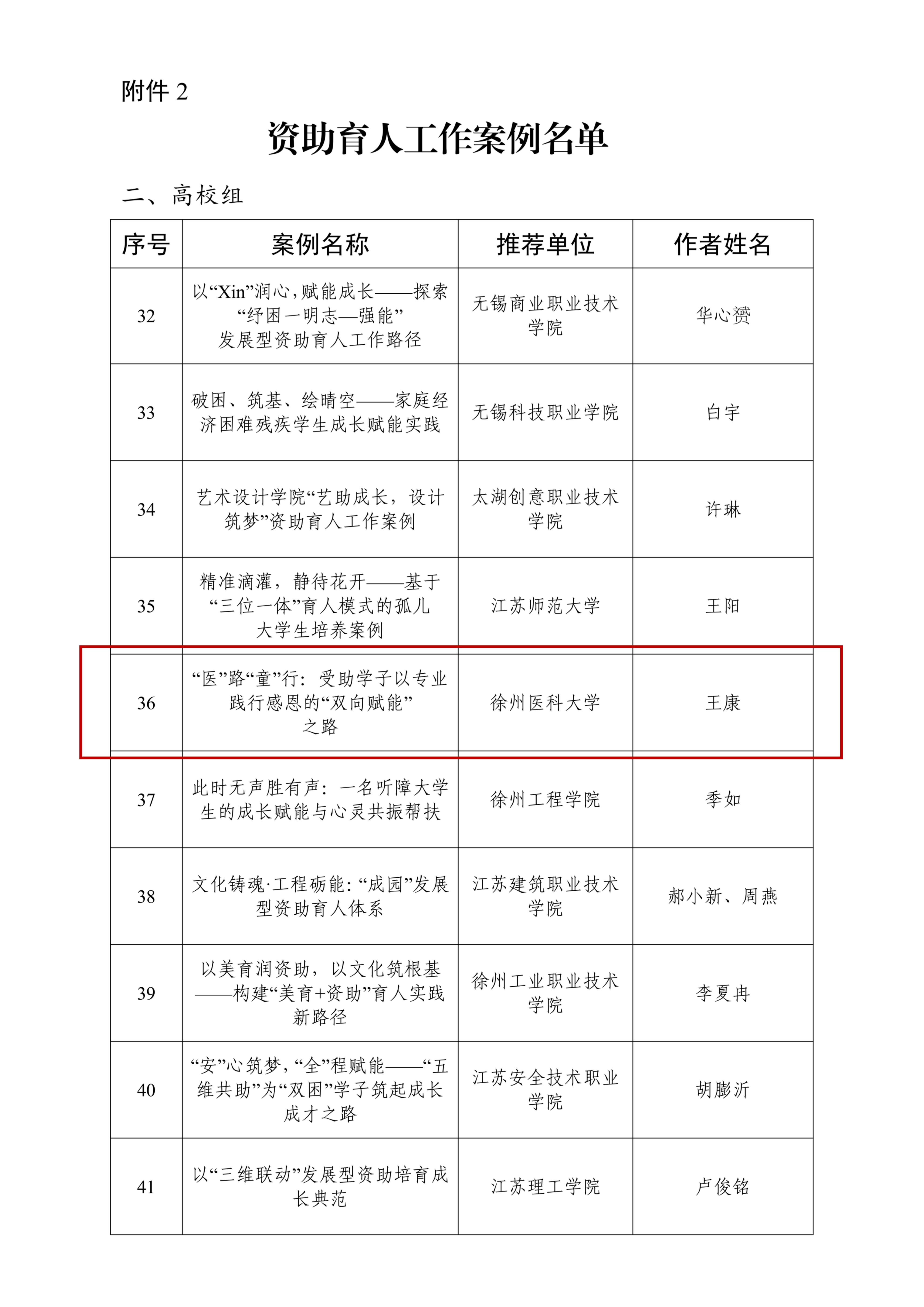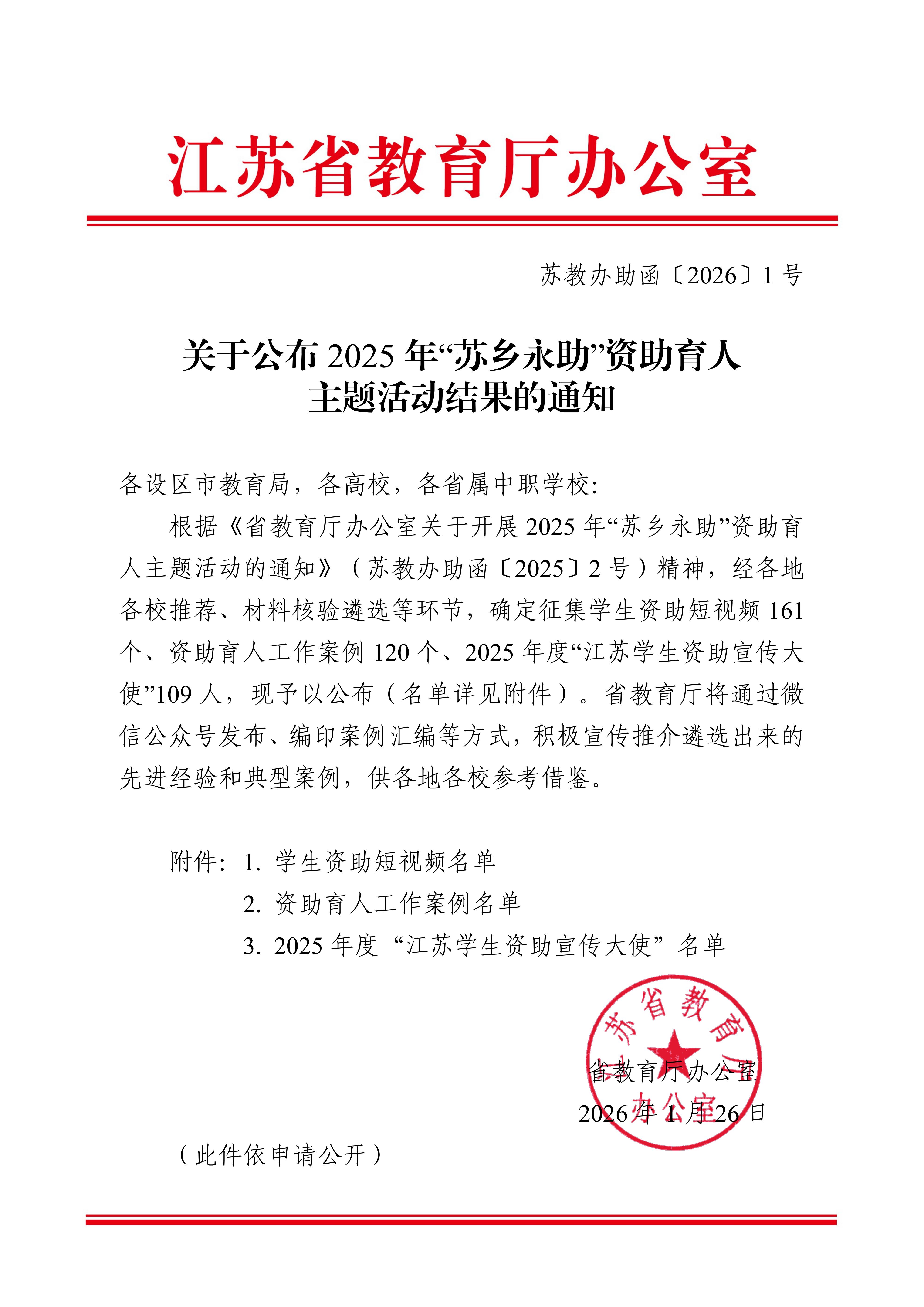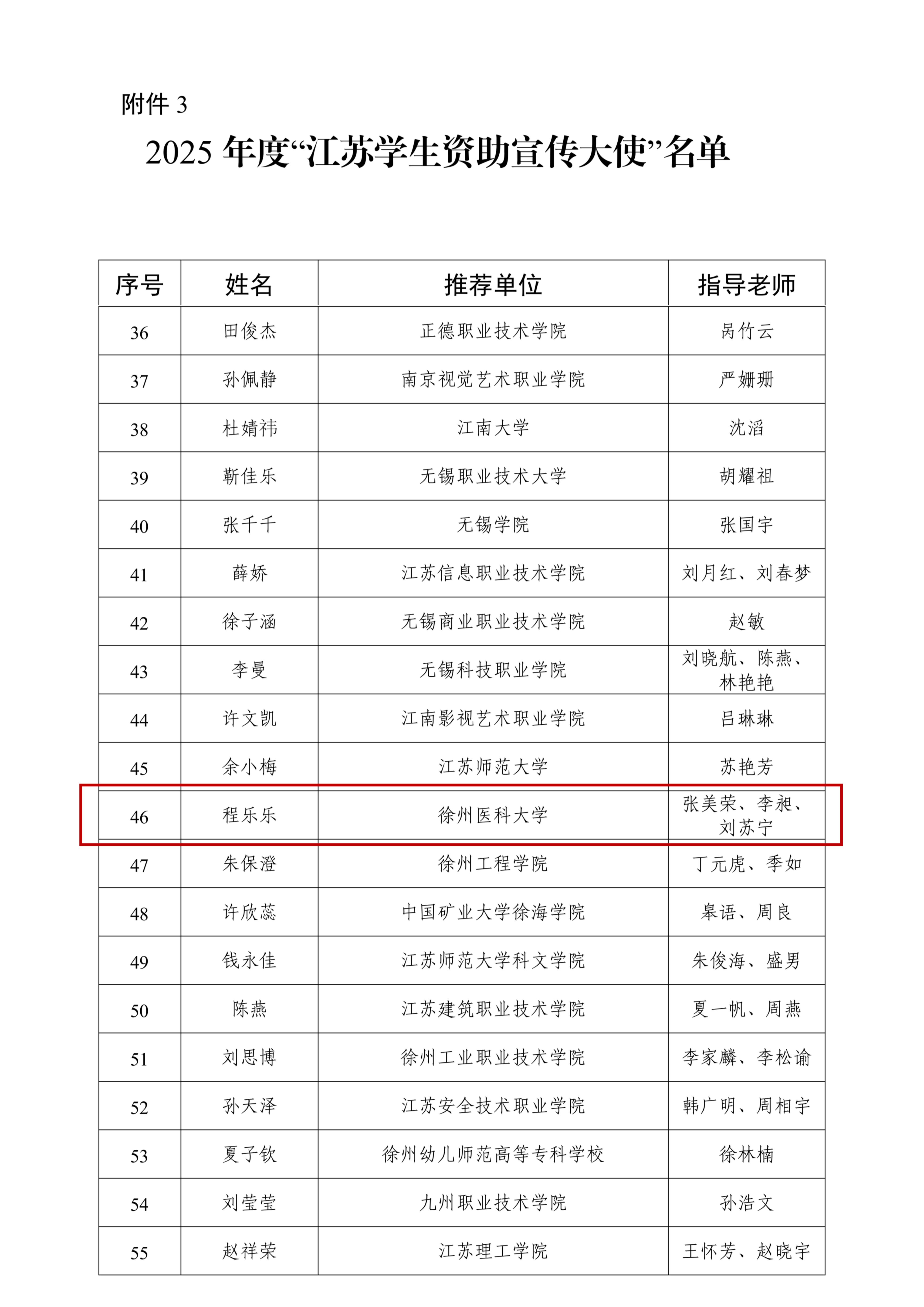 近日,江苏省教育厅公布2025年“苏乡永助”资助育人主题活动评选结果,我校2个项目荣获表彰。其中,第一临床医学院辅导员王康老师的《“医”路“童”行:受助学子以专业践行感恩的“双向赋能”之路》获评资助育人工作案例;第一临床医学院2023级本科生程乐乐同学荣获“江苏学生资助宣传大使”称号。
