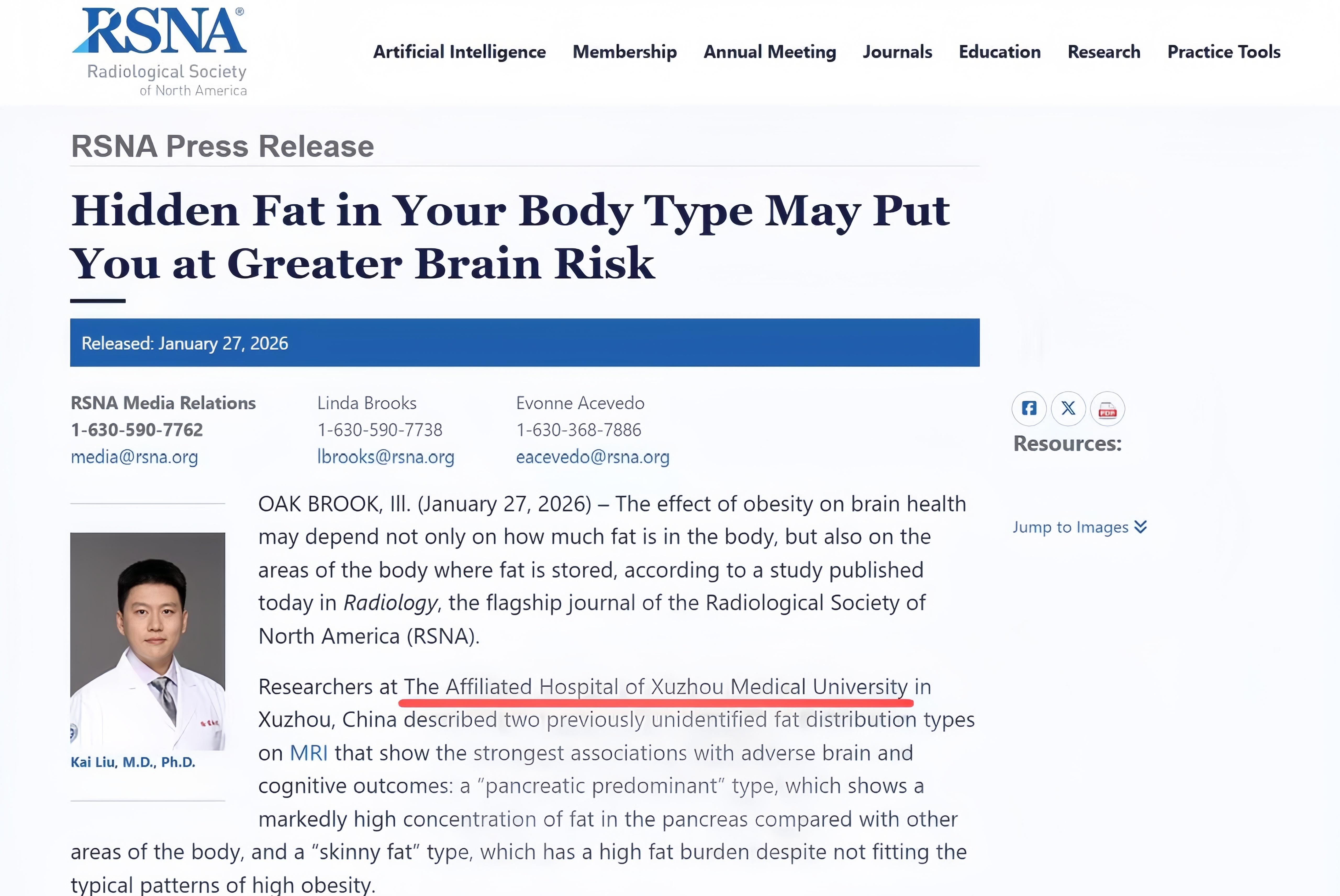 该成果受到国际同行高度关注,被全球放射学领域最具影响力的学术组织-北美放射学协会(RSNA)选为新闻报道。徐医附院刘恺教授应邀接受协会采访,并于美国时间1月27日被MSN、Medical Xpress、ScienceDaily等多家国际知名媒体同步报道(https://www.rsna.org/media/press/2026/2639),这是徐医附院成为国内目前极少数获RSNA专访的机构之一。