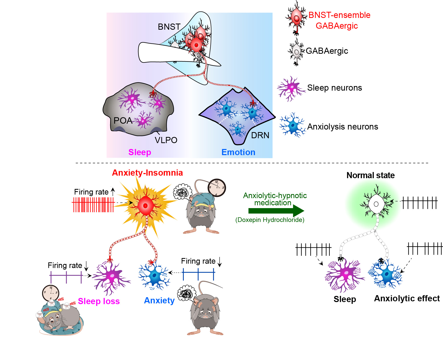 这些结果表明BNST应激神经元(GABA能)同时编码焦虑情绪和调控睡眠/觉醒行为。焦虑或失眠均会引起这群神经元过度兴奋,并通过BNST-POA通路进一步抑制POA睡眠神经元,引起或恶化失眠症状。同时,通过BNST-DRN通路抑制DRN神经元,引起或加重焦虑情绪,最终导致焦虑-失眠共病并形成恶性循环。本研究针对焦虑-失眠共病的机制提出新理论,为治疗焦虑-失眠共病提供新的细胞、分子靶标,具有潜在的科学价值和临床意义。