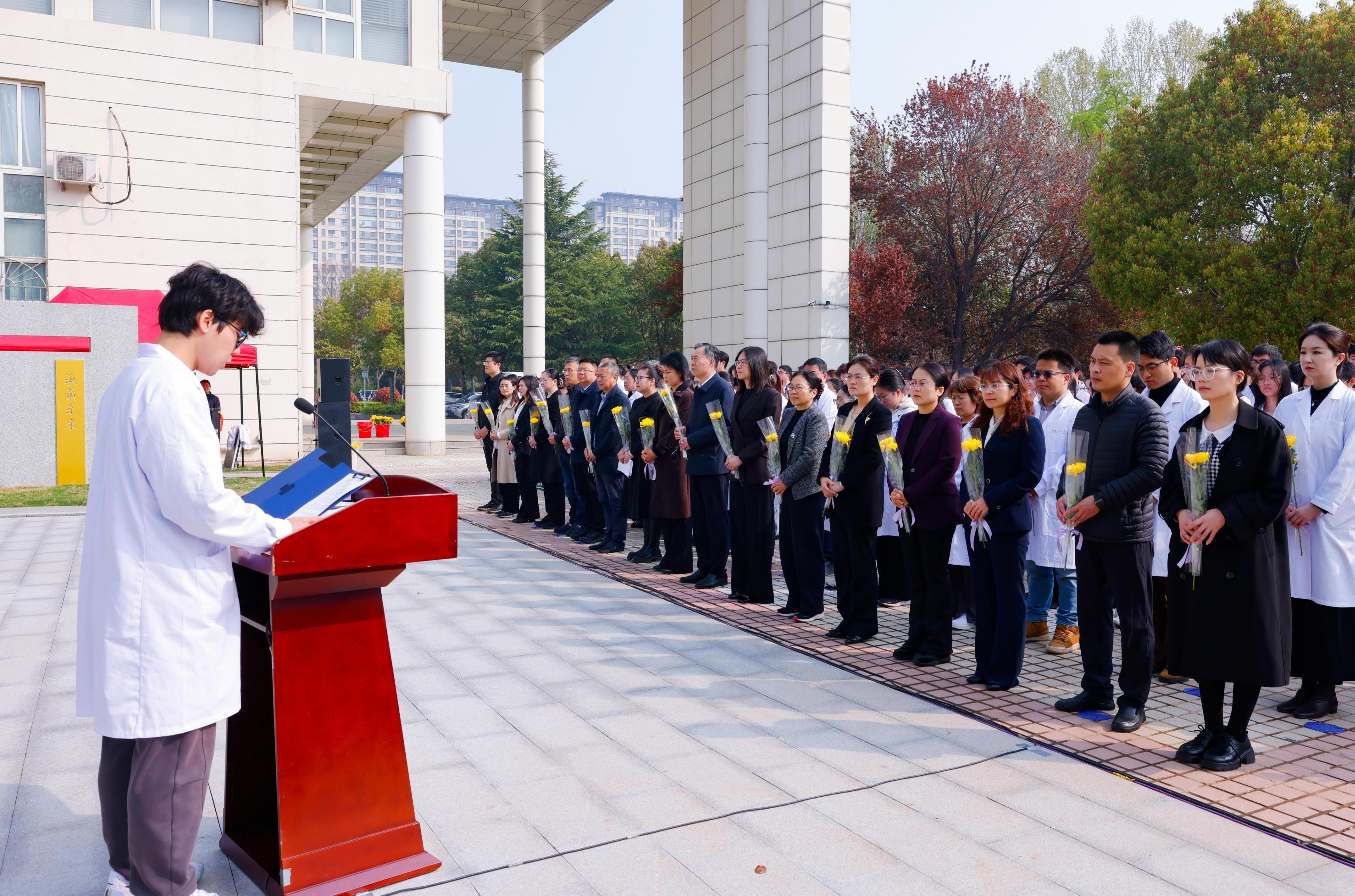 4月1日上午,我校在主校区大体老师纪念园隆重举行“以生命对话生命,用微光映照大爱”清明缅怀大体老师暨解剖课开课仪式。校党委书记祝木伟,校党委常委、副校长王媛,徐州市红十字会党组书记康宁,徐州市红十字会副会长赵学忠,遗体捐献者家属代表中国矿业大学程洁教授出席仪式。学校相关职能部门负责人、各学院分管学生工作领导、基础医学院领导班子成员、解剖教研室全体教师、研究生和本科生代表共同参加。仪式由基础医学院党委书记韩红柳主持。