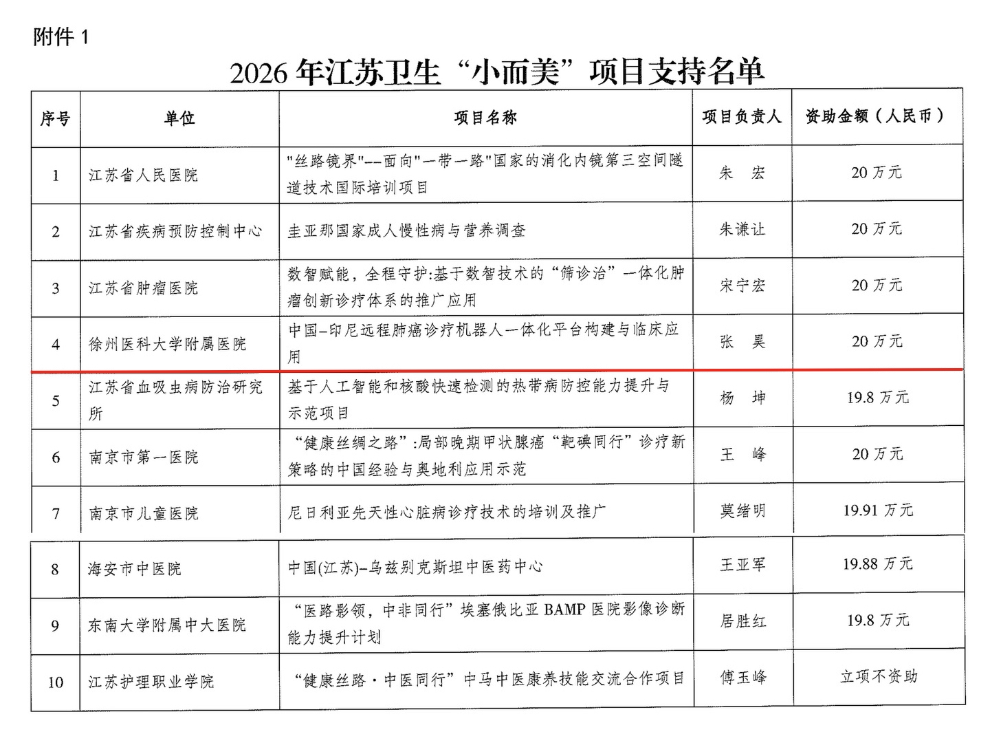 近日,2026年江苏卫生“小而美”项目评审结果公布,数智慢病防治江苏省高校重点实验室、徐医附院胸外科共同申报的《中国-印尼远程肺癌诊疗机器人一体化平台构建与临床应用》项目成功获批立项。
