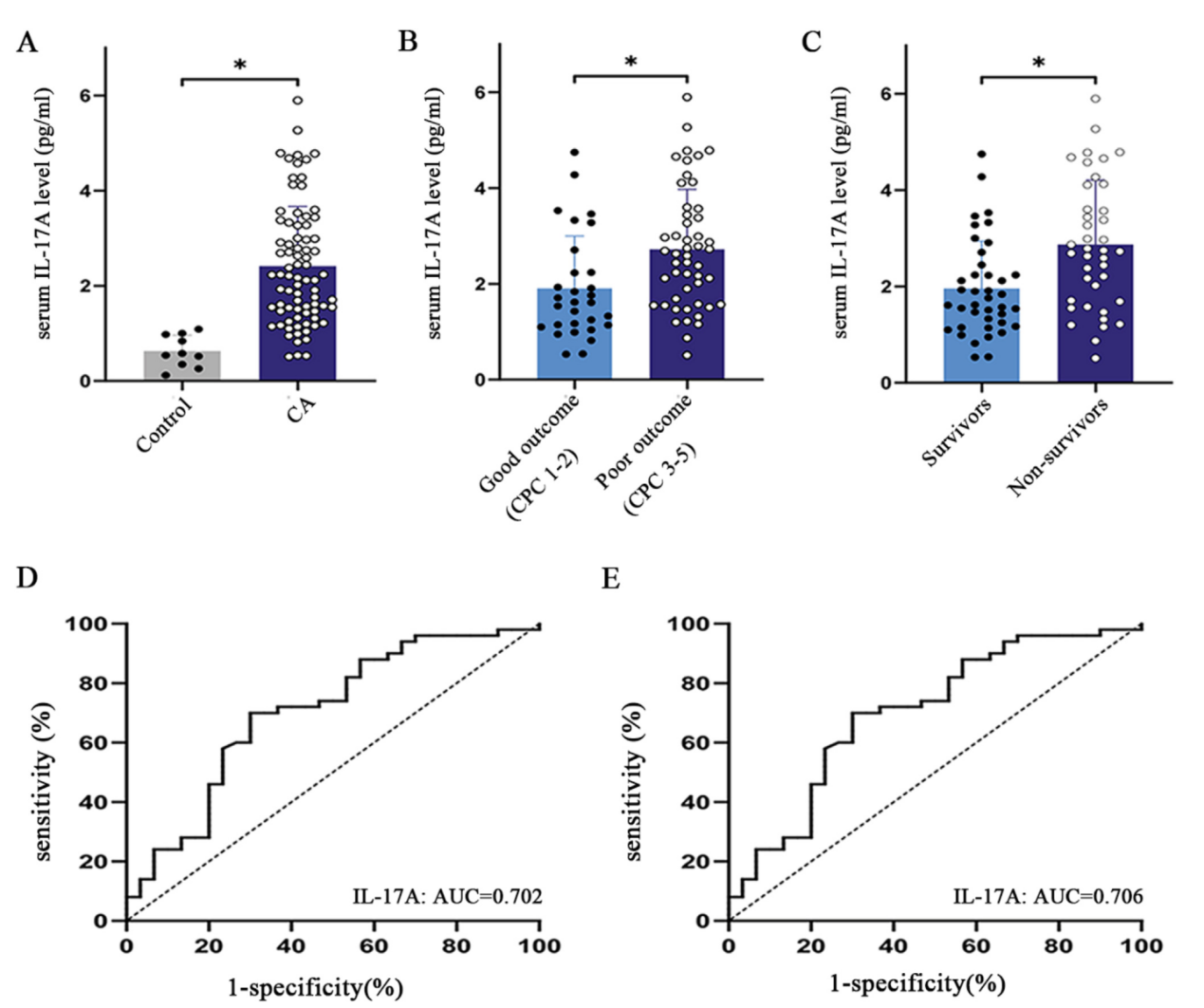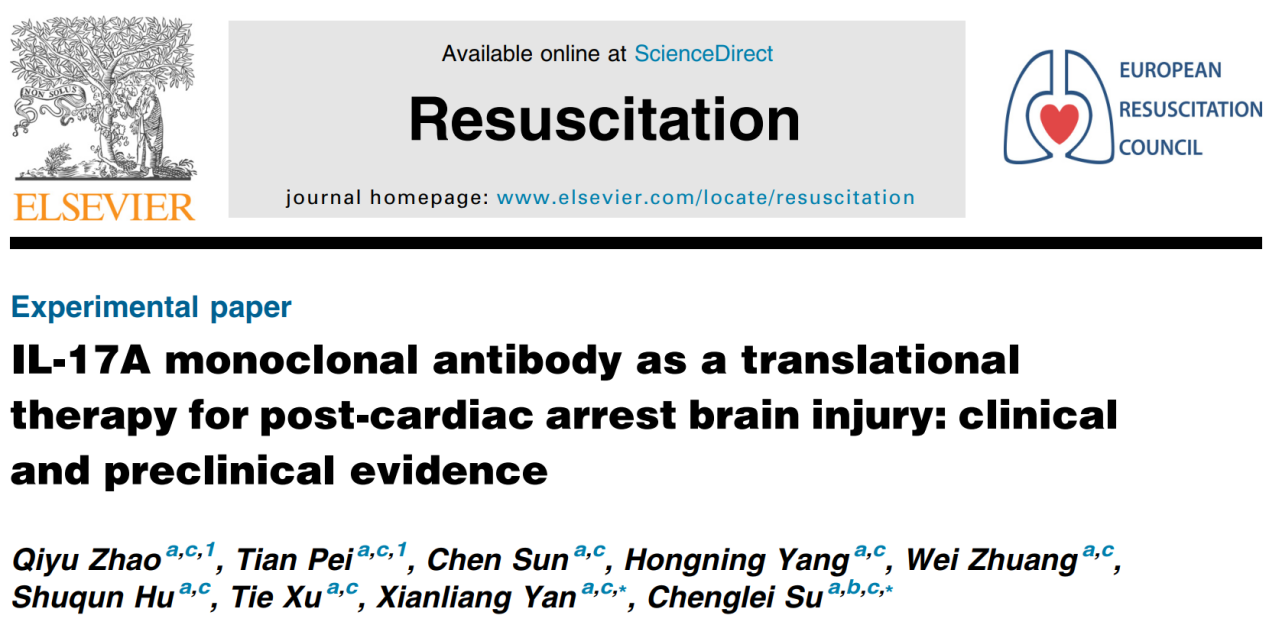 近期,我校急诊医学科团队在国际心肺复苏领域权威期刊《Resuscitation》(中科院一区TOP)在线发表了题为“IL-17A monoclonal antibody as a translational therapy for post-cardiac arrest brain injury: clinical and preclinical evidence”的研究论文。该论文采用转化医学研究方法,结合临床数据与动物实验,首次系统揭示了白细胞介素-17A(IL-17A)作为心脏骤停后脑损伤(PCABI)早期预后生物标志物及潜在治疗靶点的重要价值。该研究受到期刊高度重视,同期发表了专题社评。