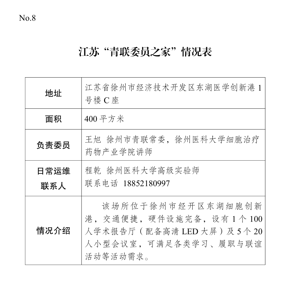 此次获批的“青联委员之家”位于徐州市经济技术开发区东湖医学创新港1号楼C座,交通便捷、设施完备。阵地设有一个可容纳100人的学术报告厅及5个20人规格小型会议室,功能布局合理、设备齐全,可一站式满足青联委员理论学习、履职研讨、交流联谊、主题宣讲等多元需求。