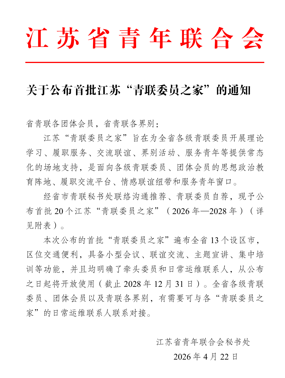 江苏“青联委员之家”是省青联面向各级青联委员、团体会员打造的思想政治教育阵地、履职交流平台、情感联谊纽带和服务青年窗口,旨在为理论学习、履职服务、交流联谊、界别活动等提供常态化场地支持。