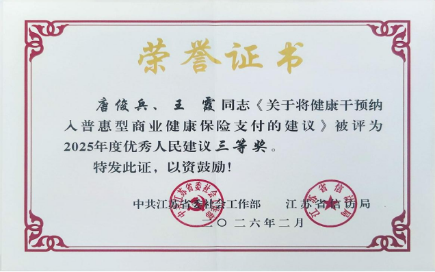 近日,中共江苏省委社会工作部、江苏省信访局联合公布2025年度优秀人民建议评选结果。我校护理学院专职组织员唐俊兵副教授与护理学院教师第一党支部书记王霞副教授共同撰写的《关于将健康干预纳入普惠型商业健康保险支付的建议》荣获三等奖。该建议全文已于3月30日在中国江苏网“民声汇”栏目刊发,引发学界与业界关注。