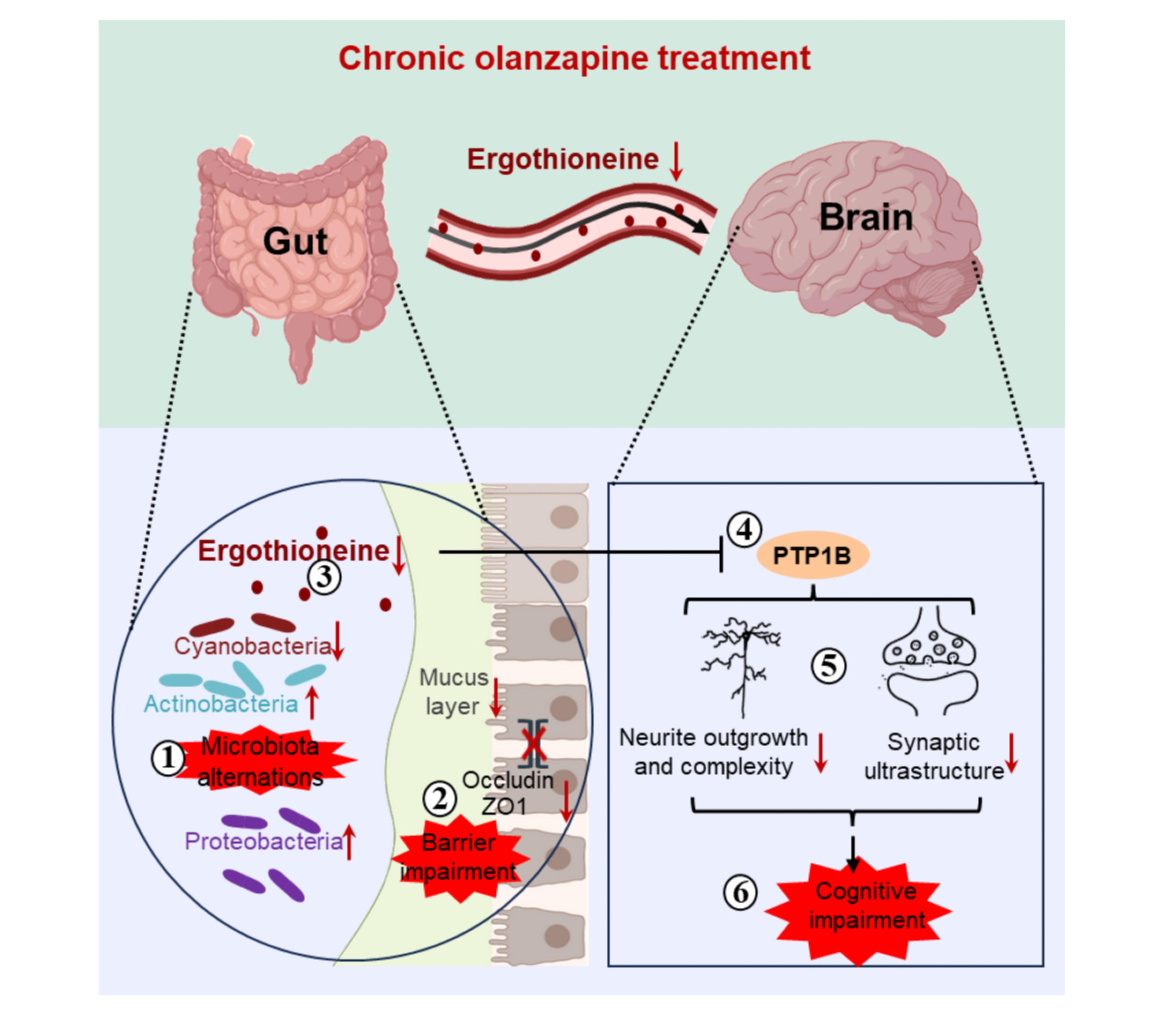 抗精神病药物是治疗精神分裂症和双相情感障碍的一线用药,虽能有效控制精神分裂症患者的幻觉和妄想,却常带来一个令人困扰的副作用——认知功能下降。长期以来,学界将这些认知损害归因于疾病本身进展或药物对神经递质的直接作用,却忽视这些药物在穿越血脑屏障之前,首先经过的是肠道,而肠道微生物是否在其中发挥作用以及扮演着怎样的角色并不清楚。本研究通过多组学分析发现,长期使用抗精神病药奥氮平导致小鼠肠道菌群失调及肠道屏障受损,显著降低血液和大脑中肠道菌群来源的代谢物麦角硫因水平,且这种耗竭与产麦角硫因细菌(如Cyanobacteria及其下属分类单元)的减少密切相关。此外,麦角硫因的缺失可引起海马体氧化应激,并激活氧化敏感的PTP1B(蛋白酪氨酸磷酸酶1B),而在海马神经元中特异性敲除PTP1B可阻断奥氮平诱导的突触和认知功能障碍。本研究阐明了“肠道菌群-麦角硫因-PTP1B”轴在抗精神病药物神经副作用中的关键作用,为防治长期抗精神病治疗相关认知功能损伤开辟了新的潜在干预策略。