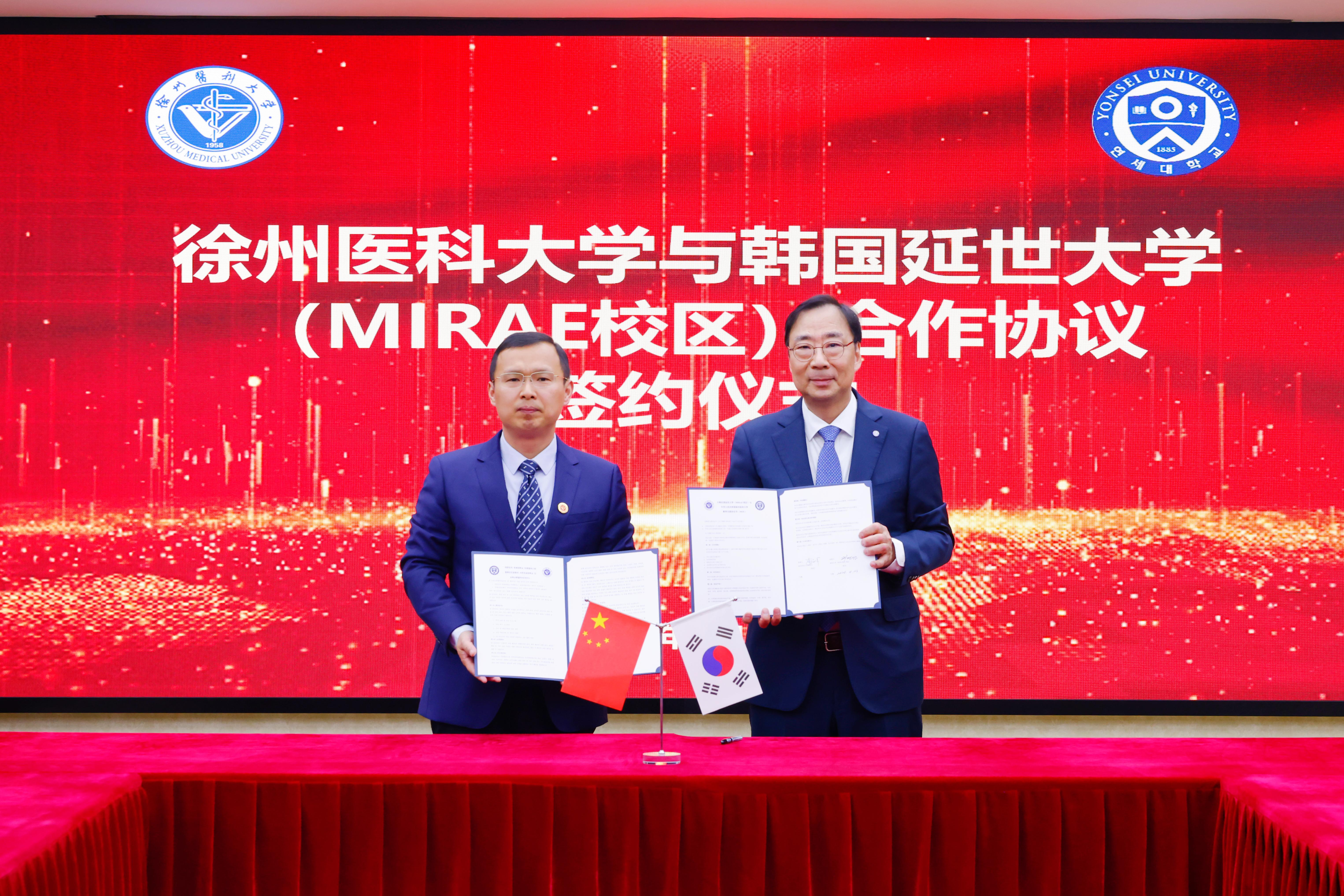 在与会嘉宾的共同见证下,李海洋与河连燮签署《延世大学(未来校区)与徐州医科大学教育交流协议书》;医学影像学院党委书记马凯与延世大学放射线融合工程学科主任郑龙铉签署《徐州医科大学医学影像学院与延世大学放射线融合工程系硕博连读联合培养项目协议书》。