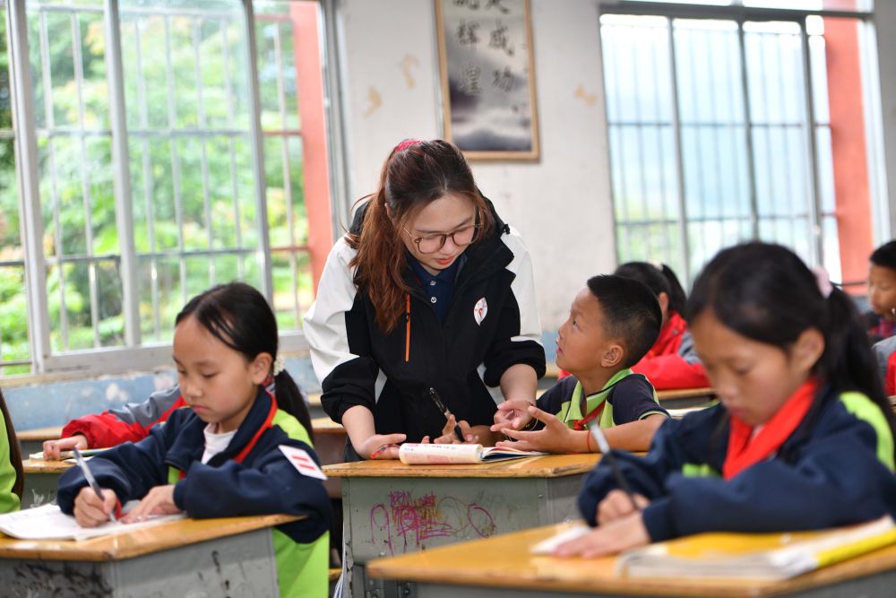 4月24日,徐州医科大学的研究生支教团成员刘金陵在贵州省黄平县上塘镇中心小学为学生辅导作业。