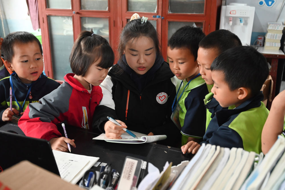 4月25日,徐州医科大学的研究生支教团成员汤丽文在贵州省黄平县上塘镇中心小学办公室辅导学生作业。