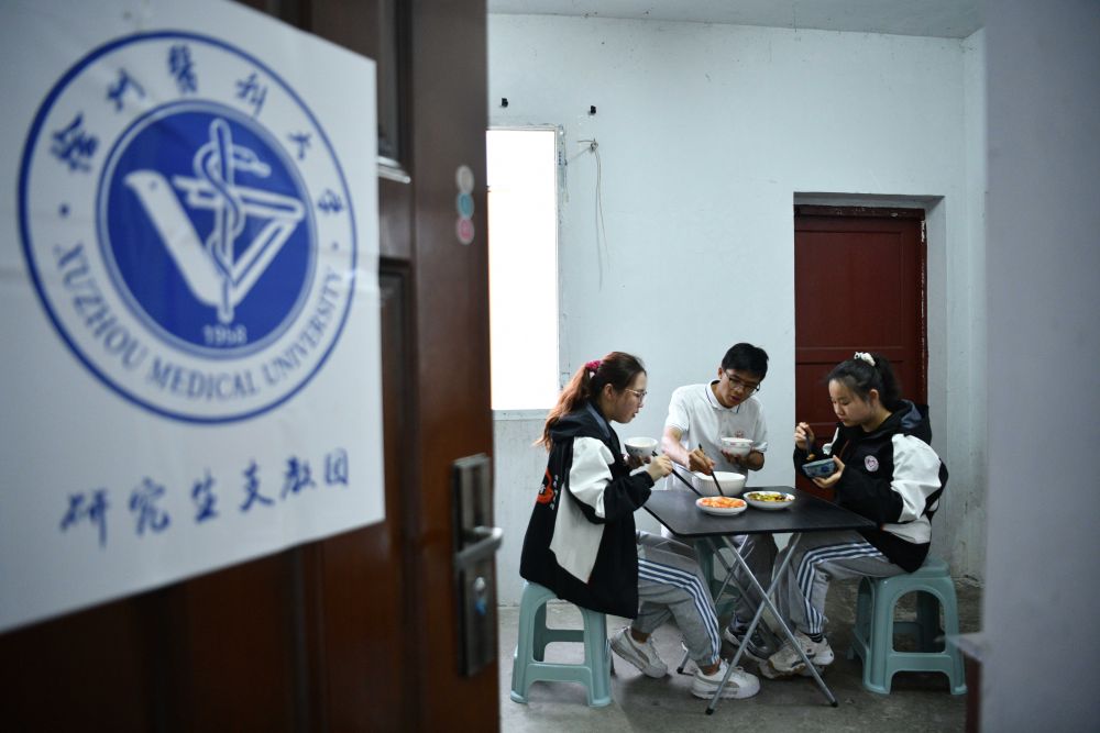 4月24日,徐州医科大学的研究生支教团成员刘金陵(左)、顾纪生(中)和汤丽文在贵州省黄平县上塘镇中心小学一起吃晚饭。