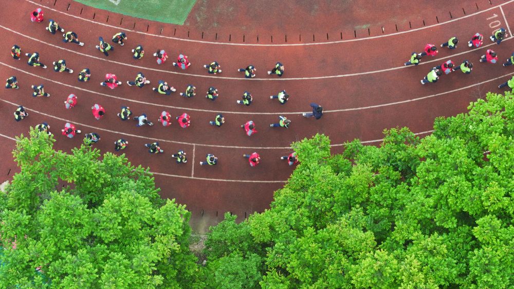↑4月25日,徐州医科大学的研究生支教团在贵州省黄平县上塘镇中心小学带领学生进行大课间活动(无人机照片)。