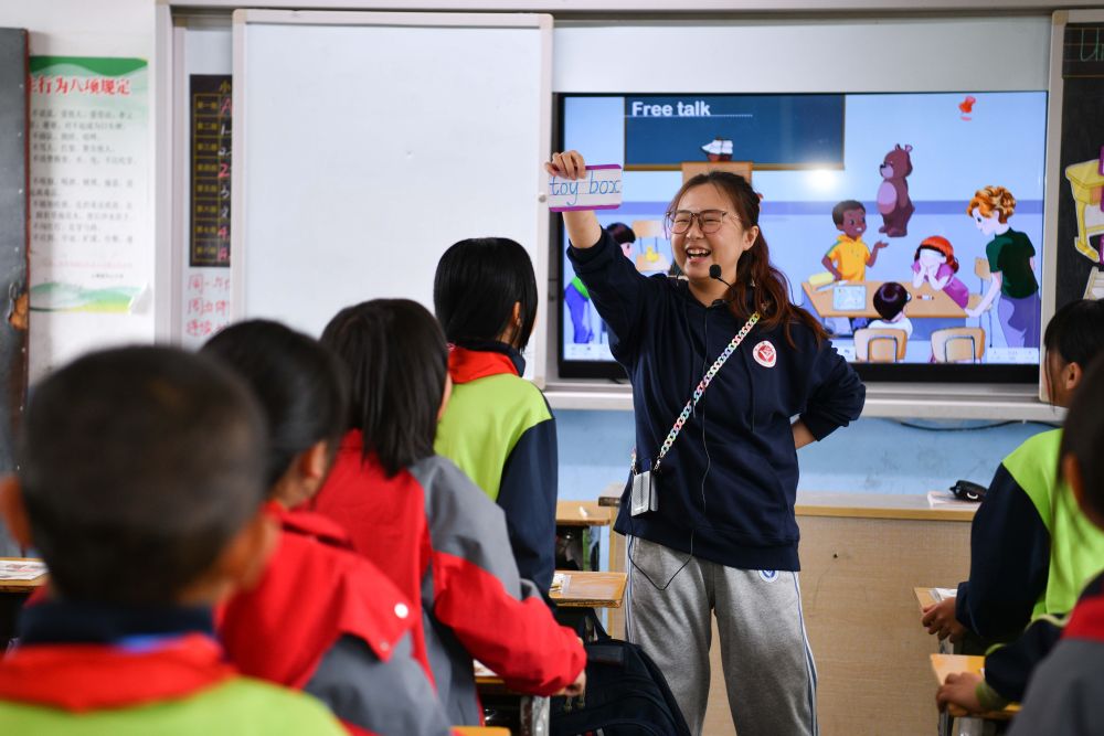 4月25日,徐州医科大学的研究生支教团成员刘金陵在贵州省黄平县上塘镇中心小学给学生们上英语课。
