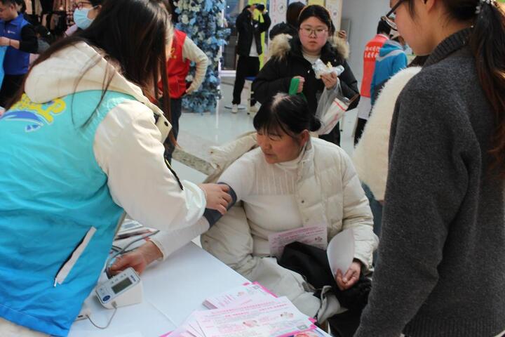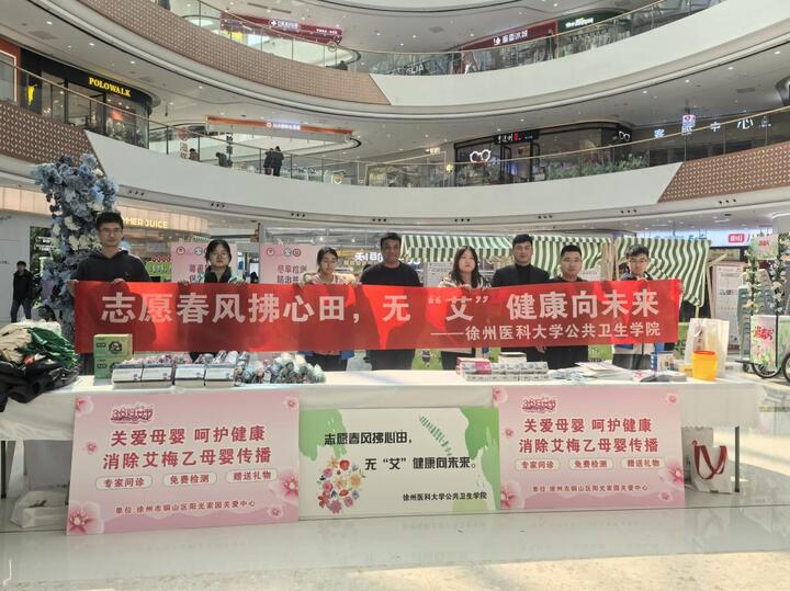 3月8日,第 116 个“三八”国际妇女节当天,志愿队联合徐州市铜山区妇幼保健院、铜山区阳光家园关爱中心,在铜山万达广场开展“‘锋’护她安,无‘艾’同行”主题公益服务活动。活动采用“义诊+宣教”双轨并行模式,为市民提供免费血压血糖检测、健康咨询及防艾知识普及,并为适龄女性设置私密、便捷的HIV免费初筛服务。依托商圈客流优势,本次活动服务市民逾1000人次,实现专业医疗资源与社会公共空间的高效联动,彰显了公共卫生学子服务社会的责任担当。