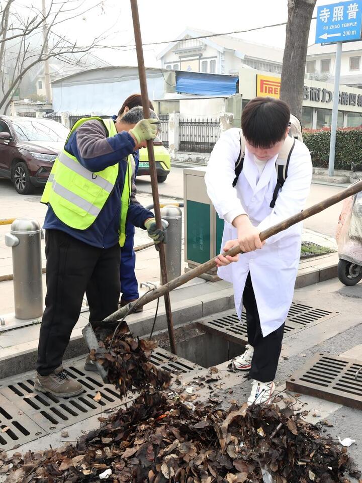 走出展厅、走向一线,这堂“行走的大思政课”进入实操阶段。师生们在四班职工指导下,穿戴工装参与窨井清淤等无风险岗位实操,真切感受一线工作者扎根岗位的艰辛与不易。同时,学生们充分发挥药学专业优势,践行“专业赋能+社会服务”理念,现场为四班职工开展用药咨询服务,并发放精心准备的“药学健康礼包”,用实际行动为基层工作者的健康保驾护航。从学习感悟到服务实践,从接受精神洗礼到主动奉献社会,这堂行走的思政课真正实现了思政教育与实践育人的深度融合,构建了流动的“移动课堂”。
