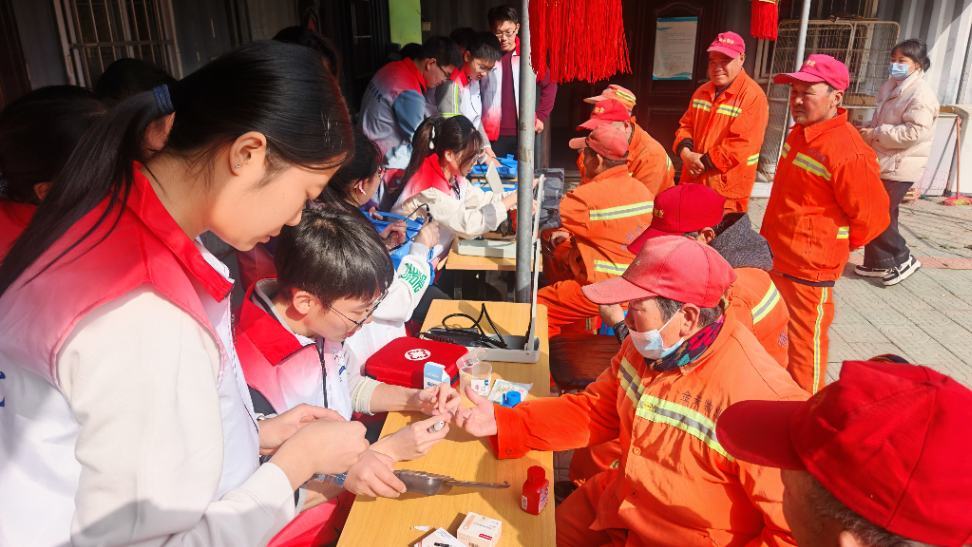 师生志愿团队专门走进环卫工人群体,针对其长期户外作业、劳动强度大等特点,提供血压、血糖测量服务,并讲解高血压、关节损伤等职业健康防护知识。一句句“您辛苦了”的暖心问候,让志愿精神在春风中传递。