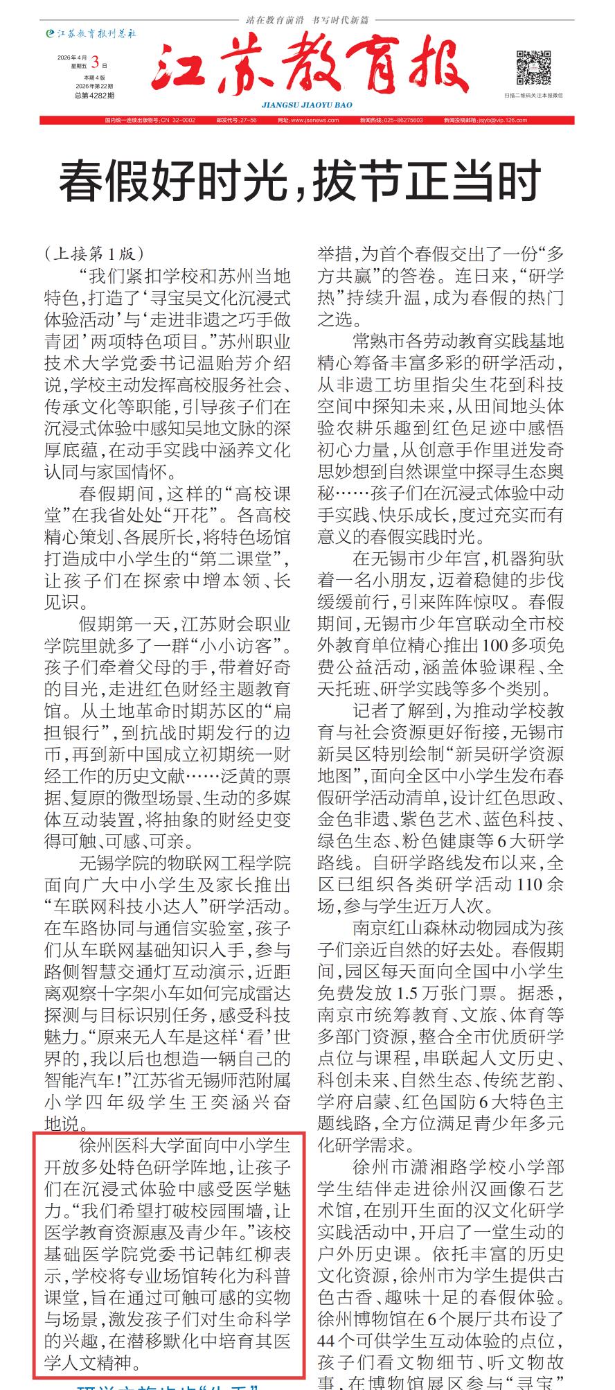徐州医科大学面向中小学生开放多处特色研学阵地,让孩子们在沉浸式体验中感受医学魅力。“我们希望打破校园围墙,让医学教育资源惠及青少年。”该校基础医学院党委书记韩红柳表示,学校将专业场馆转化为科普课堂,旨在通过可触可感的实物与场景,激发孩子们对生命科学的兴趣,在潜移默化中培育其医学人文精神。