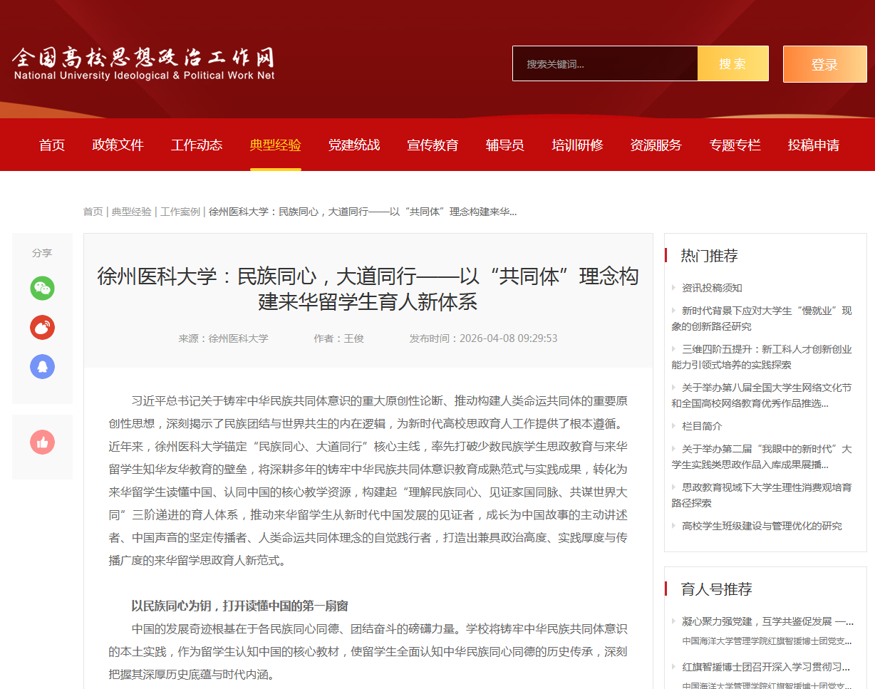 习近平总书记关于铸牢中华民族共同体意识的重大原创性论断、推动构建人类命运共同体的重要原创性思想,深刻揭示了民族团结与世界共生的内在逻辑,为新时代高校思政育人工作提供了根本遵循。近年来,徐州医科大学锚定“民族同心、大道同行”核心主线,率先打破少数民族学生思政教育与来华留学生知华友华教育的壁垒,将深耕多年的铸牢中华民族共同体意识教育成熟范式与实践成果,转化为来华留学生读懂中国、认同中国的核心教学资源,构建起“理解民族同心、见证家国同脉、共谋世界大同”三阶递进的育人体系,推动来华留学生从新时代中国发展的见证者,成长为中国故事的主动讲述者、中国声音的坚定传播者、人类命运共同体理念的自觉践行者,打造出兼具政治高度、实践厚度与传播广度的来华留学思政育人新范式。