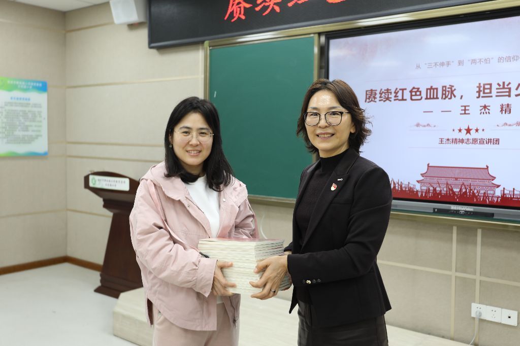 教工第一党支部郑娟老师向云苑路小学魏群校长赠送王杰精神相关书籍,她深情表示:“看到大学生和小学生能够通过王杰精神产生如此深刻的思想共鸣,这正是我们开展这次活动的意义所在。”