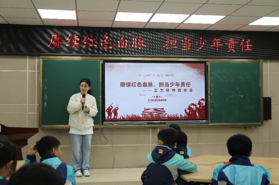 在郑婷予、王丽同学的动情讲述中,王杰精神的时代价值通过一个个生动故事传递。而随后的互动环节更将这场思想交流推向高潮——"你们的理想是什么?"这个问题引发了热烈回应。“我要当医生,像抗疫英雄那样救人!”“我想做老师,培养更多人才!”“我想把语文学好,把分数考的高高的!”"孩子们纯真而坚定的回答,让大学生们看到了红色种子在新生代心中生根发芽的希望。