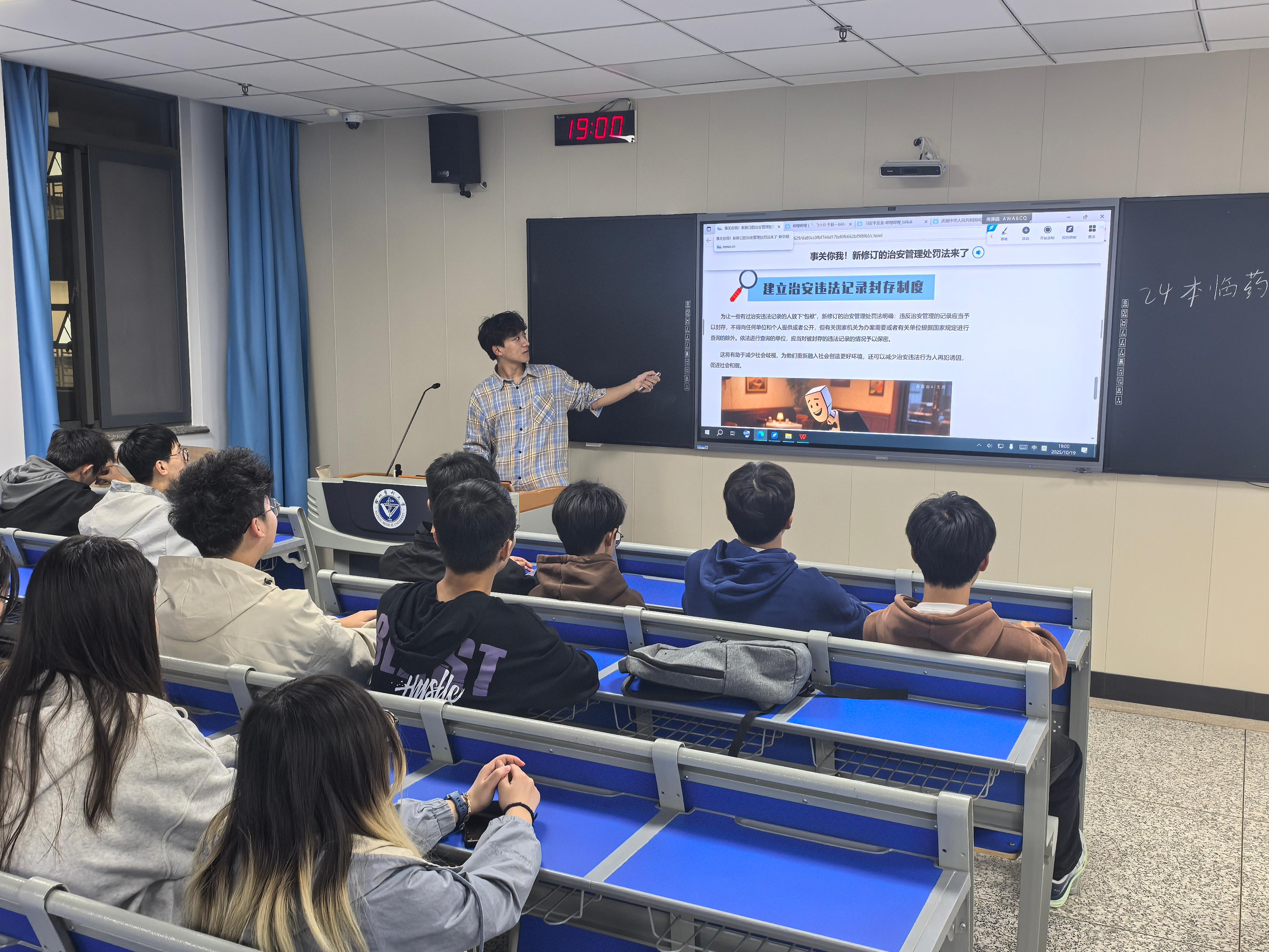 各学院开展“守望成长 法治护航”主题的班团活动,通过学习《治安管理处罚法》相关条文,明确行为“红线”与责任边界。同学们结合身边案例,共同探讨社会主义法治的丰富内涵与价值追求,在互动思辨中强化法治素养,有效掌握运用法律武器维护自身权益的方法。