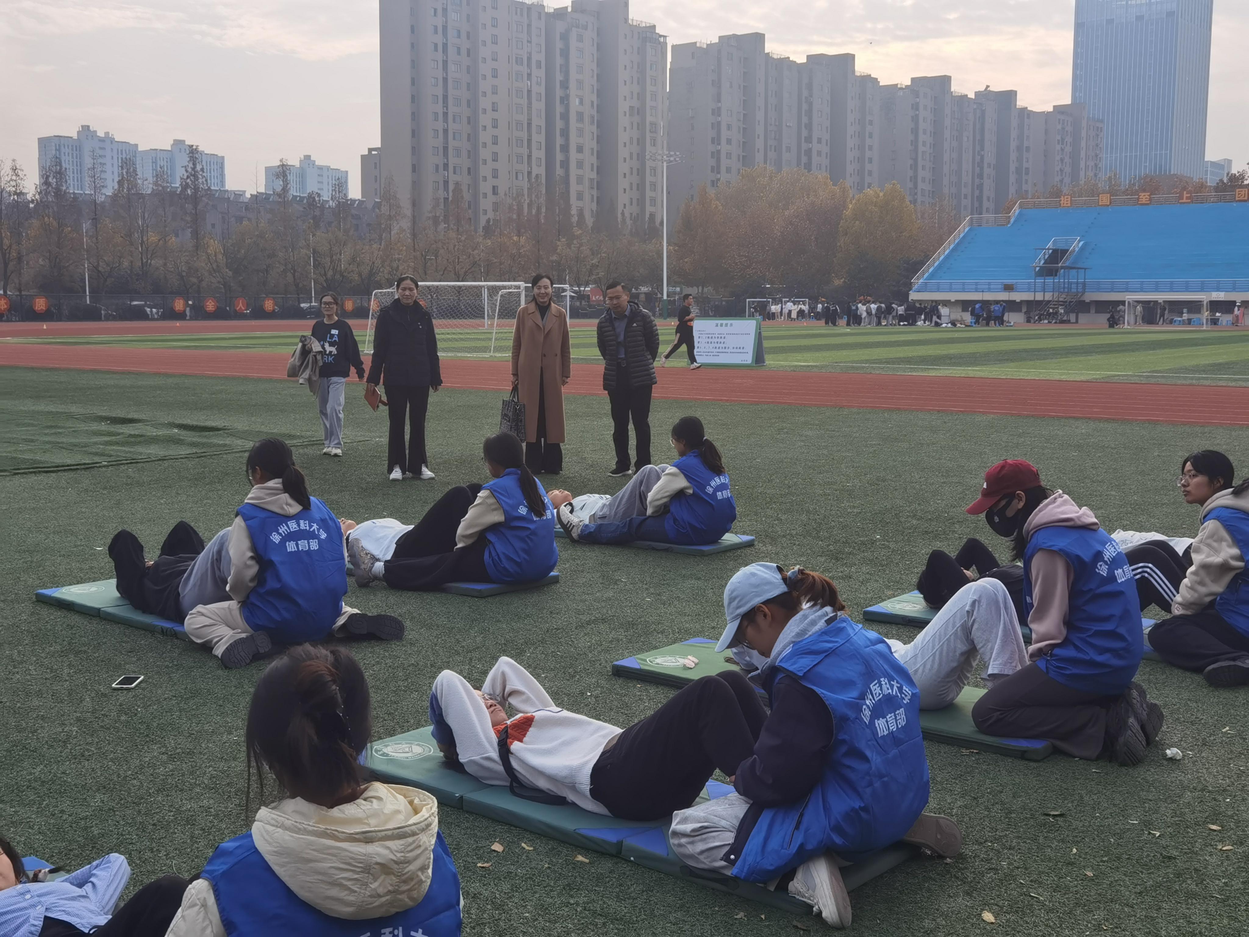 测试当日,李海洋及相关学院副书记、辅导员亲临现场为同学们加油鼓劲。体育部教师全程带队,高效完成学生分组引导、热身与项目衔接等工作,现场组织规范有序,参与测试的学生精神饱满、认真投入,充分展现了徐医学子昂扬向上的精神风貌。学工部、教务处同步跟进,宣传部全程捕捉测试精彩瞬间,保卫处维护现场秩序,校医院与120急救力量随时待命、做好应急保障,志愿者团队则协助完成引导服务。各方协同联动,为本次监测抽测工作的圆满完成提供了坚实支撑。