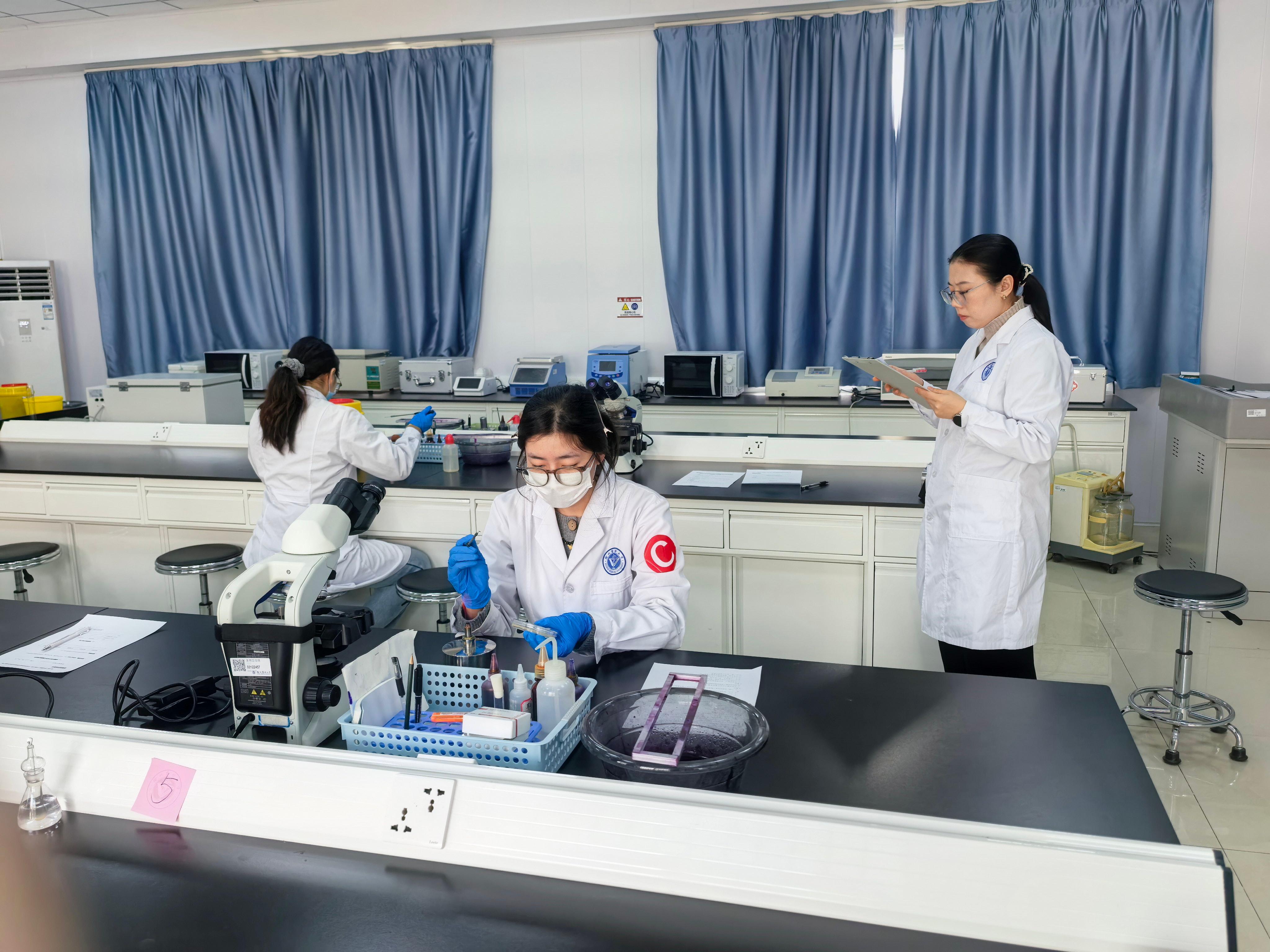大赛秉持“以赛促学、以赛提技”宗旨,设初赛、决赛、擂台赛三级闯关机制。初赛严审理论与基础实操能力,遴选优秀队伍;决赛聚焦葡萄糖氧化酶法血糖测定、细菌革兰染色等核心技能,选手规范操作、功底扎实,最终六支队伍晋级擂台赛。