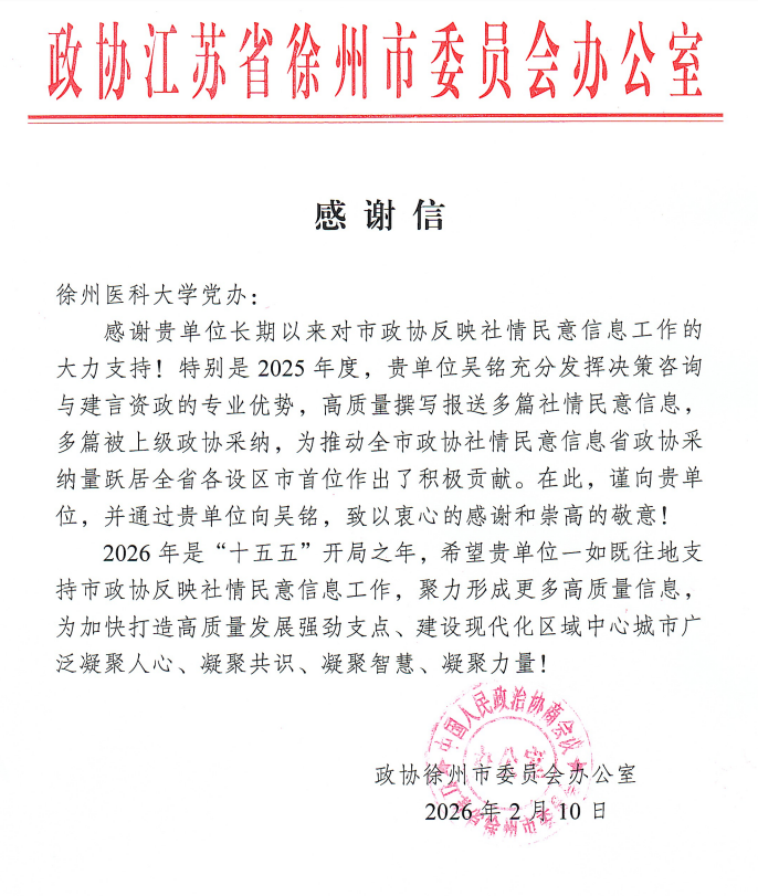 近日,学校收到政协江苏省徐州市委员会办公室发来的感谢信,信中对学校长期以来支持市政协社情民意信息工作表示诚挚感谢,尤其对我校致公党主委吴铭同志在2025年度高质量撰写报送多篇社情民意信息、助力全市政协社情民意信息省政协采纳量跃居全省各设区市首位作出的积极贡献予以高度肯定和衷心致谢。