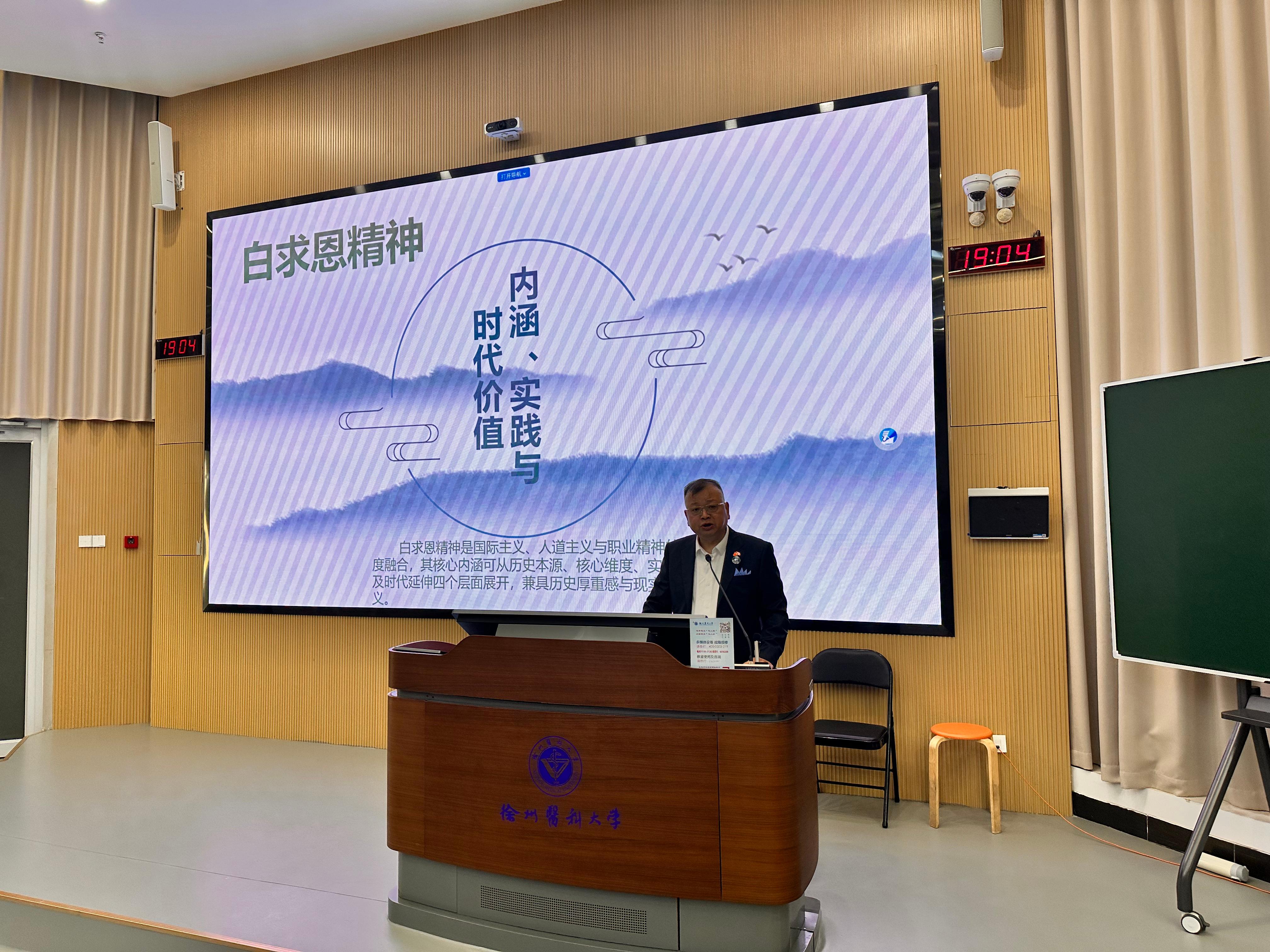 顾宇主席结合多年投身国际医学交流与公共卫生救助的实践,深情讲述白求恩跨越国界、救死扶伤的感人事迹,深度解读白求恩精神的时代内涵,阐释国际主义情怀与医者担当。他介绍了在极端艰苦条件下建立战地手术室、开展巡回医疗、培训本土医护人员的历程,展现了白求恩作为医者精益求精、勇于创新的专业态度和无私奉献精神。他还分享了基金会在疫情期间组织捐赠、搭建中外医学教育桥梁的实践案例,勉励在场学子坚守行医初心,把对生命的敬畏与无私的奉献融入职业信仰,践行“大医精诚”的铮铮誓言。