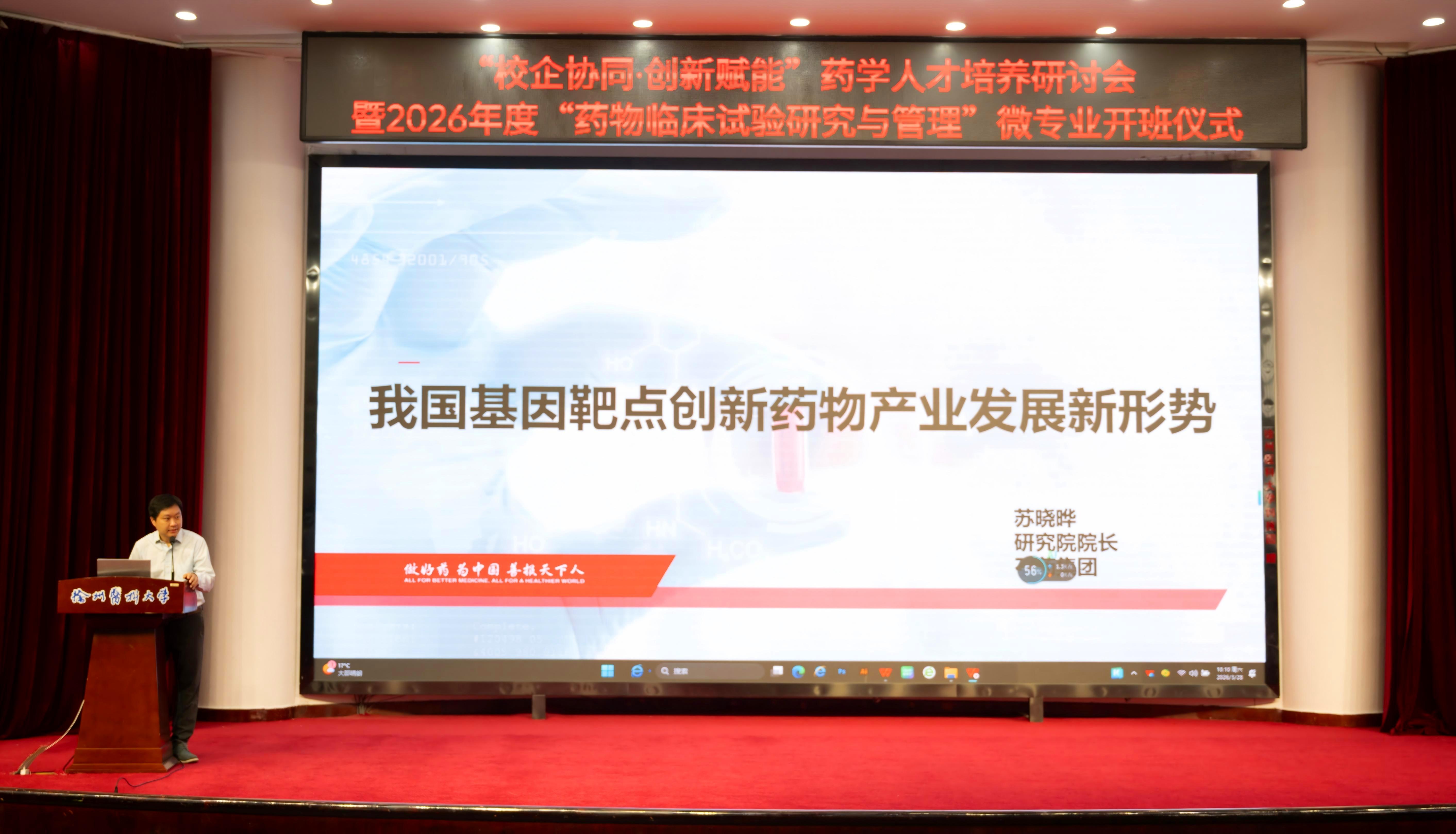 3月28日上午,学校“校企协同·创新赋能”药学人才培养研讨会暨2026年度“药物临床试验研究与管理”微专业开班仪式在主校区学术报告厅举行。校党委常委、副校长郭栋,教务处副处长赵子明,药学院领导班子,政府监管部门、医药企业、医疗机构代表等齐聚一堂,共话药学创新人才培养新路径,共谋产教融合、医教协同发展新篇章。会议由药学院院长周雪妍主持。