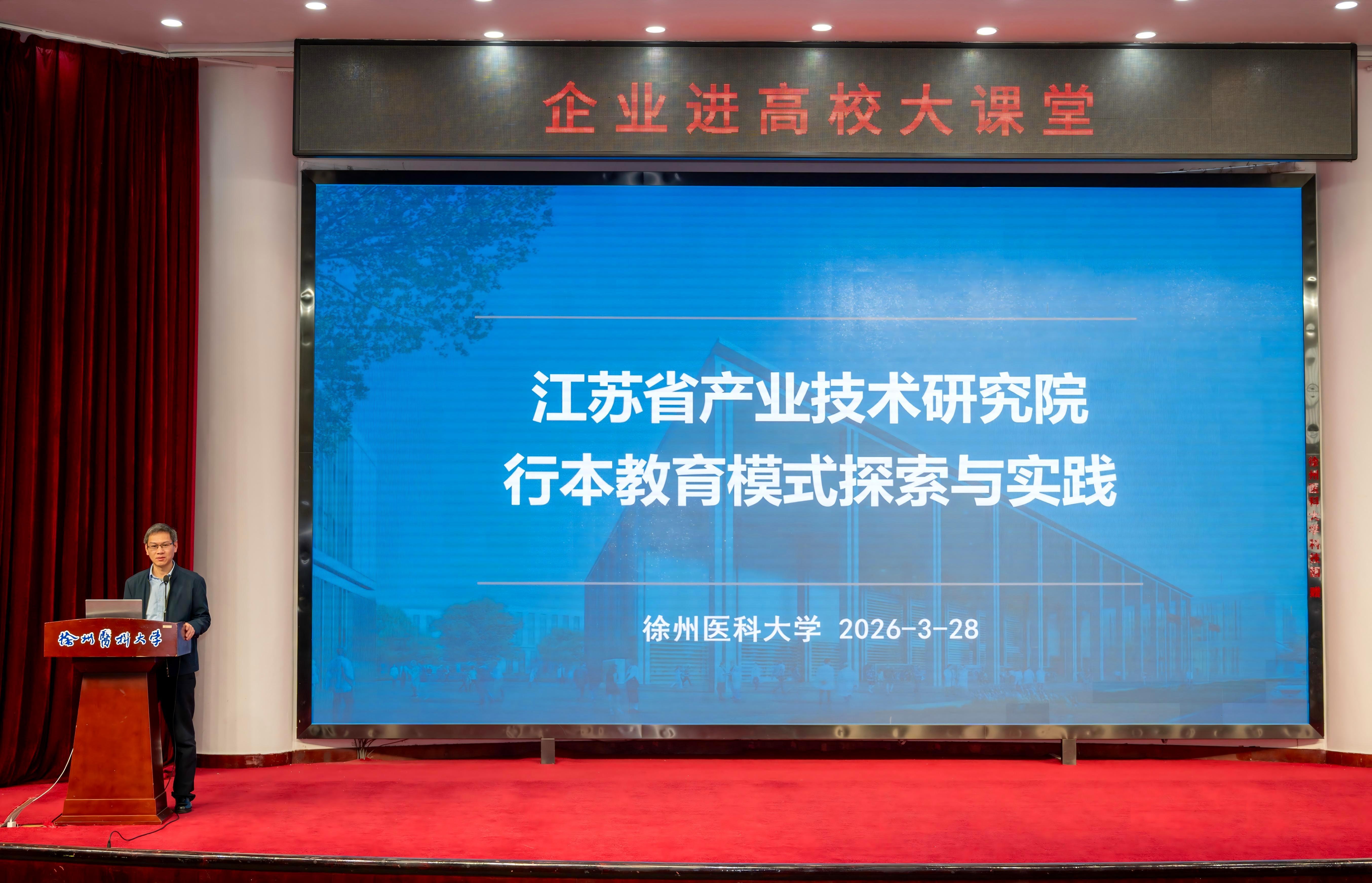 “企业进高校大课堂”环节,石药集团核酸药物研究院院长苏晓晔以“我国基因靶点创新药物产业发展新形势”为题作报告。江苏省产业技术研究院生物与医药事业部副主任、徐州泉山区科技镇长团团长温涛以“行本教育模式探索与实践”为题作分享。