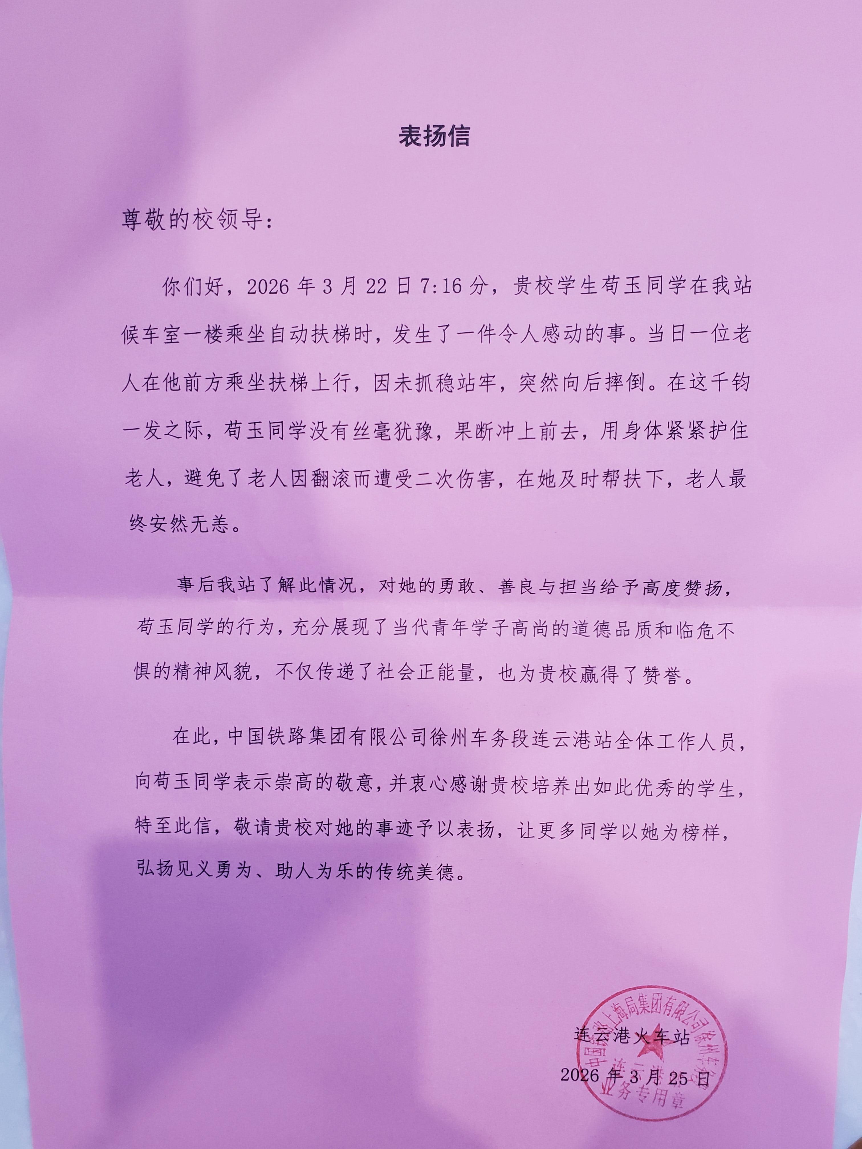 事后,中国铁路集团有限公司徐州车务段连云港站全体工作人员特意发来表扬信,对苟玉同学的勇敢、善良与担当给予高度赞扬。信中写道:“苟玉同学的行为,充分展现了当代青年学子高尚的道德品质和临危不惧的精神风貌,不仅传递了社会正能量,也为贵校赢得了赞誉。”苟玉同学用实际行动诠释了“见义勇为、助人为乐”的传统美德,也为身边师生树立了可赞可学的榜样。